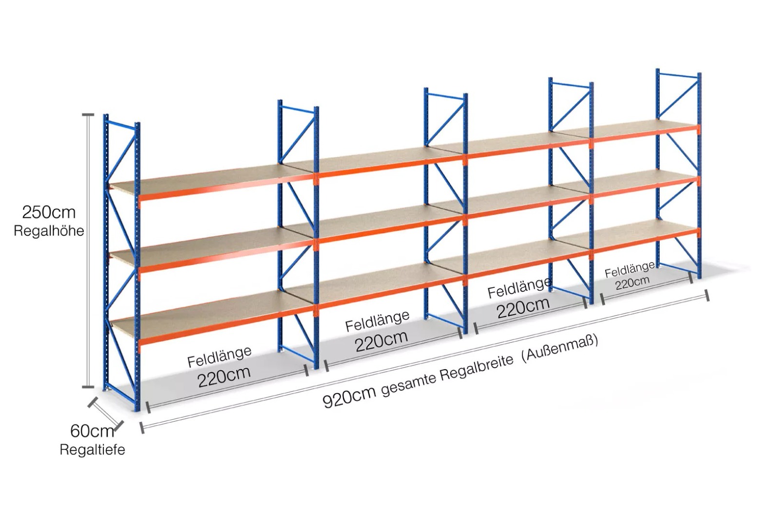 9,2 m Lagerregal LR2000 / 60 cm tief / 2,5 m hoch / 3 Ebenen / Auflage Holz