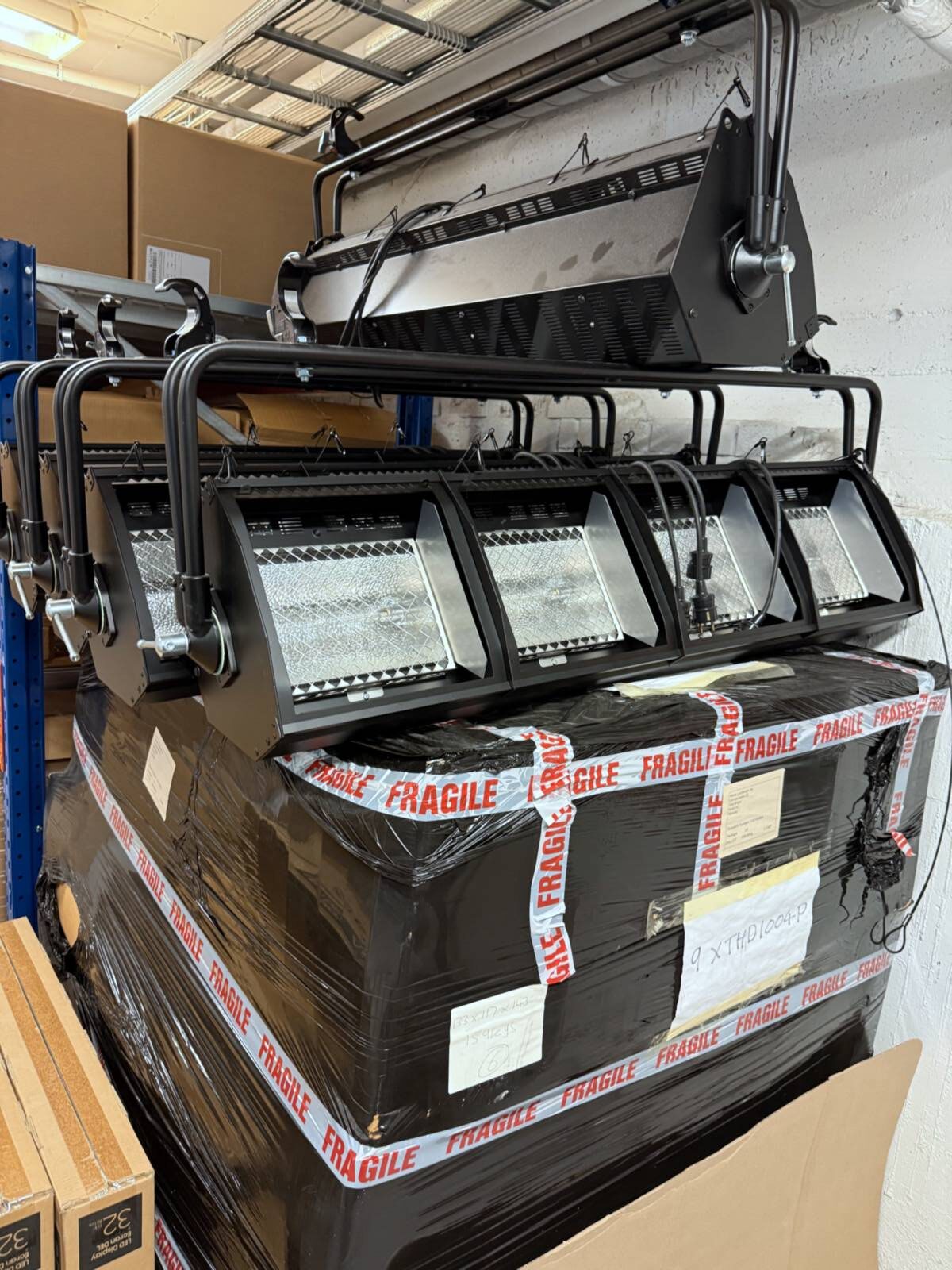 Consists of 14 fixtures that have been stored on pallets for years, some likely never used. The last operational use is unknown, and equipment is sold as-is. Includes a total of 2 pallets.