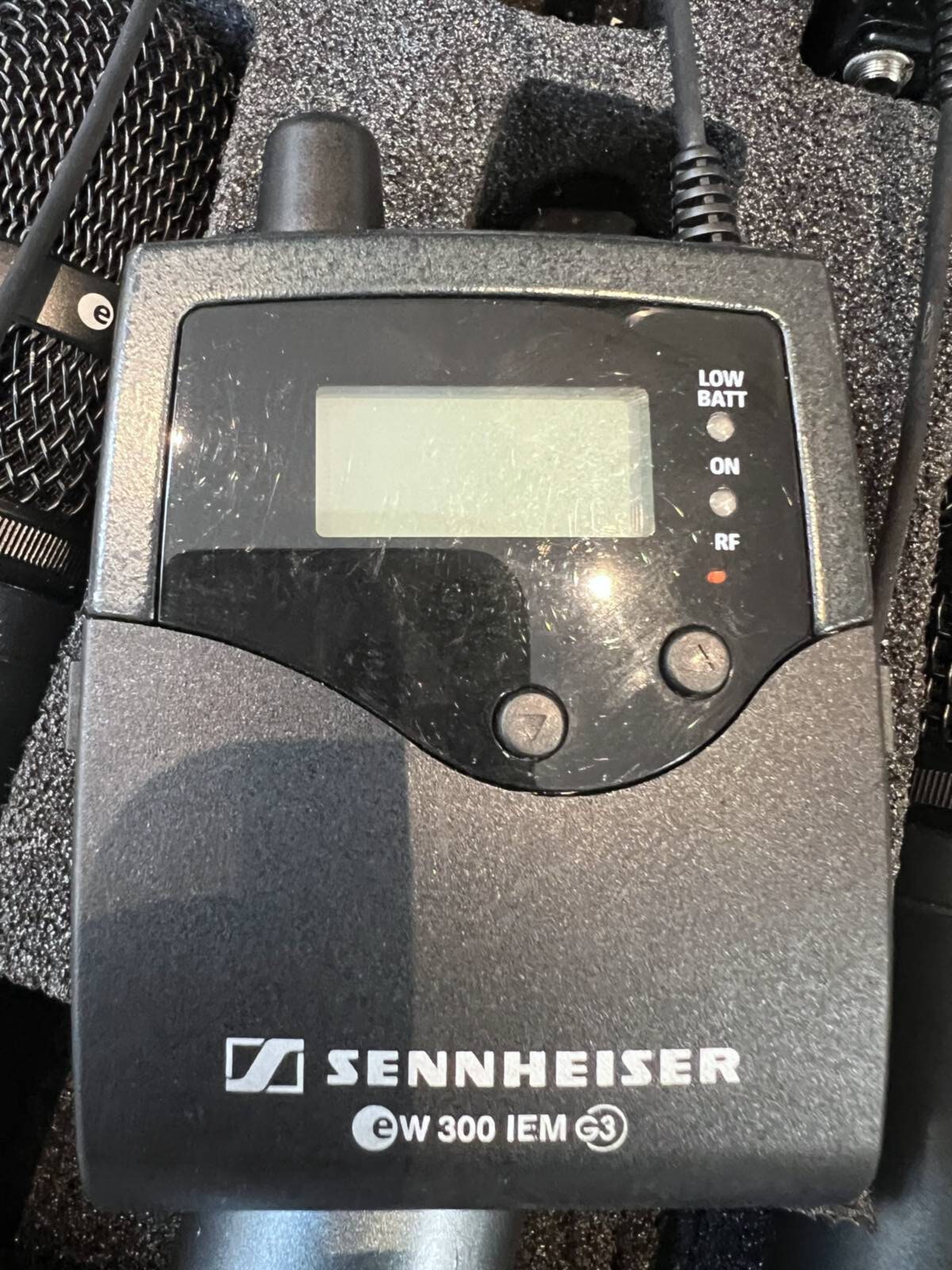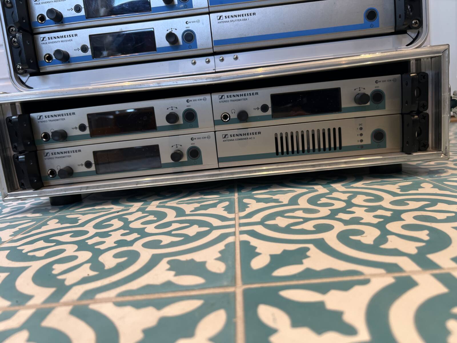 Includes three transmitters, six belt packs, a carrying case, antenna combiner, cables, extra in-ear monitor, and one antenna, all operating at the 600 MHz frequency.