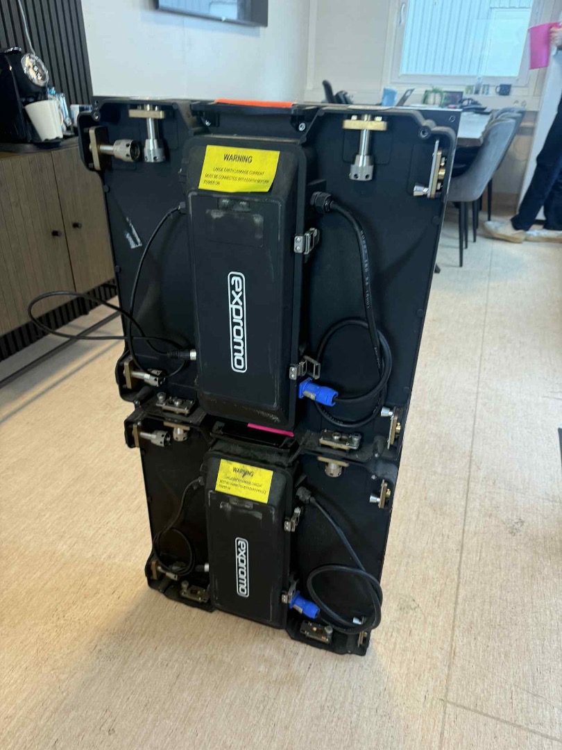 Danske Expromo LED paneler. P6 af høj kvalitet, 50x50 cm pr. panel, komplet med Nova modtagekort – i alt 55 stk. Halvdelen er sat op på første billede. Panelerne stammer fra en indendørs installation og fremstår i flot stand. Enkelte paneler kan have 1–3 små pixel-fejl. Det er ret nemt at renovere. Komplet køreklar med Nova Scaler mm. 5400 EUR eller 40.000DKK m / moms.