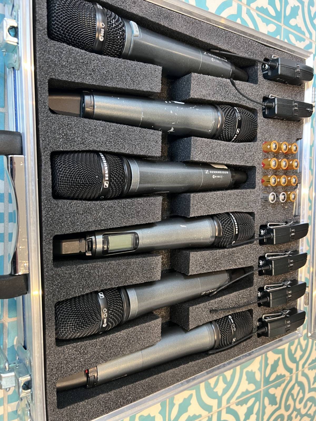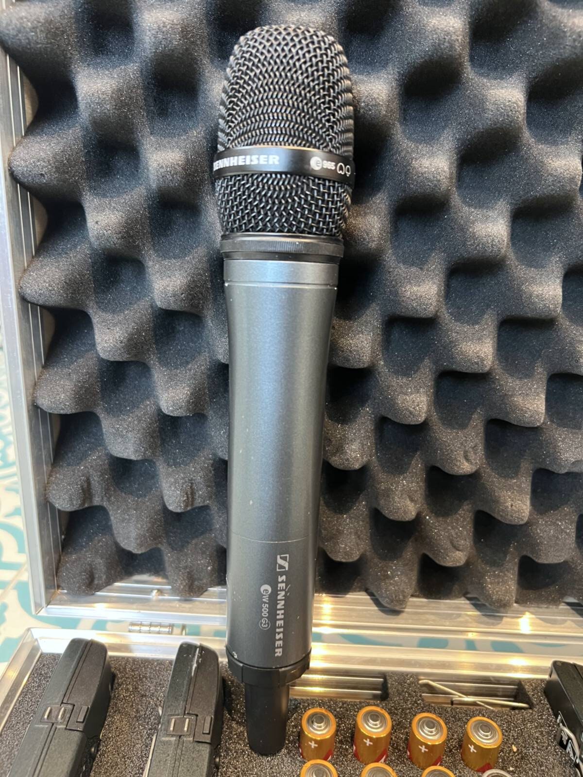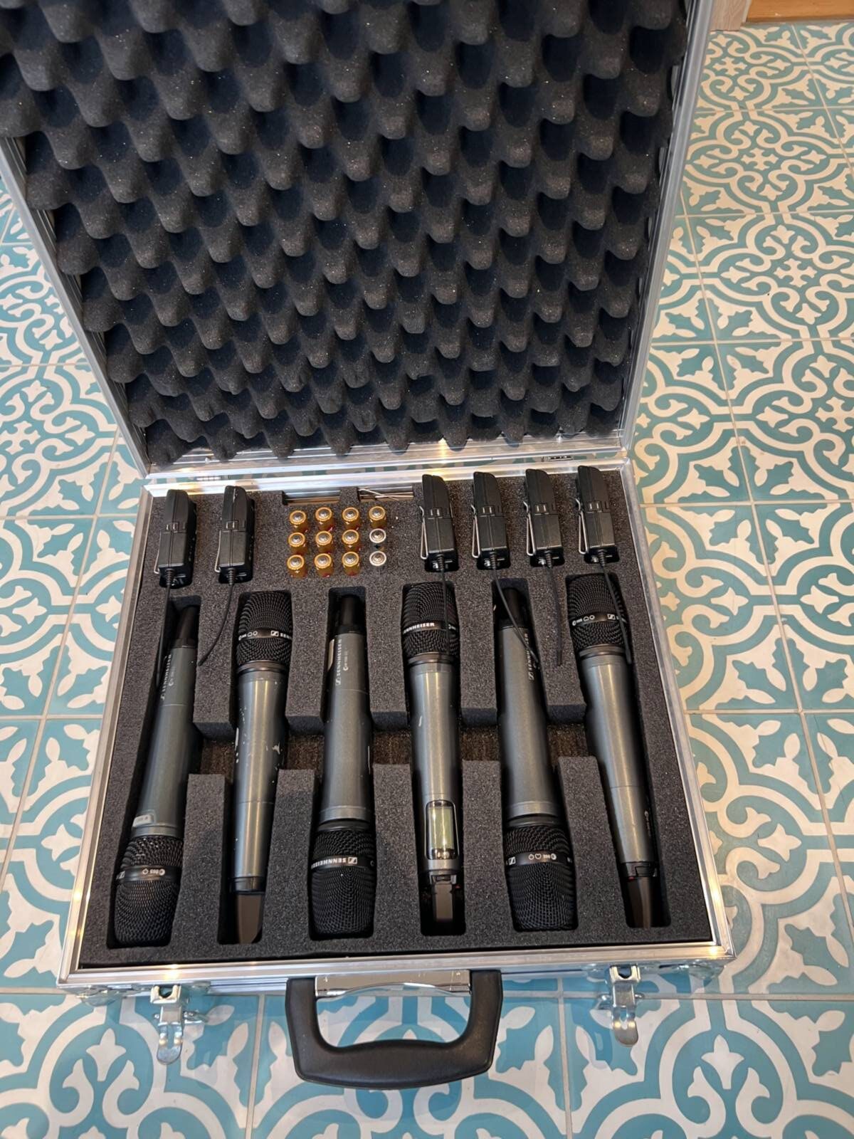 Includes multiple Sennheiser wireless microphones and receivers operating in the 560-610 MHz frequency range, with one receiver exhibiting glitches. Comes with an original Sennheiser blue case.