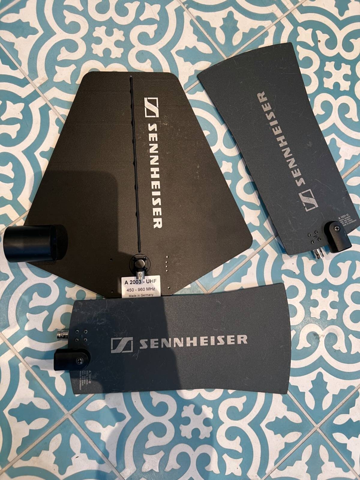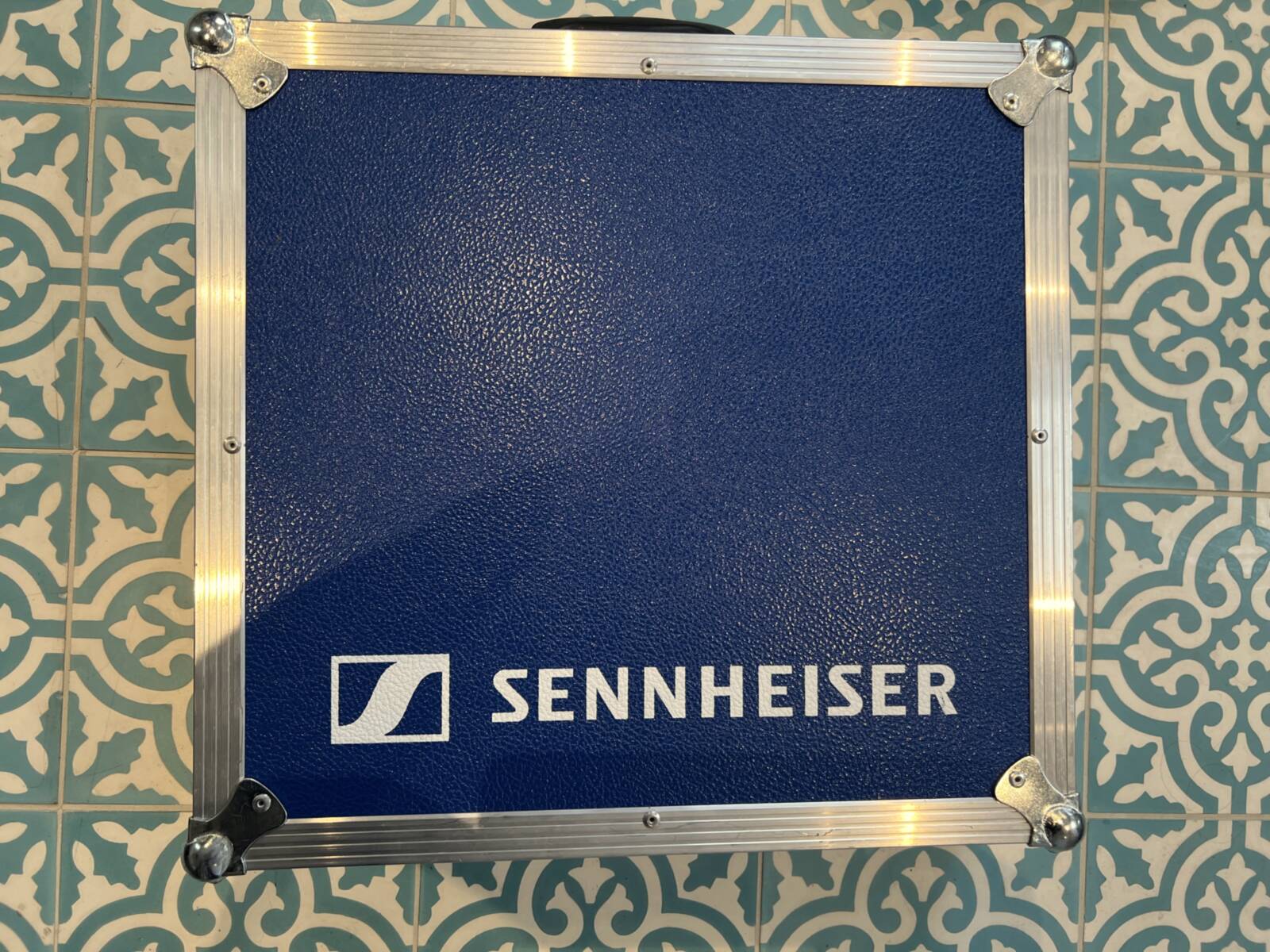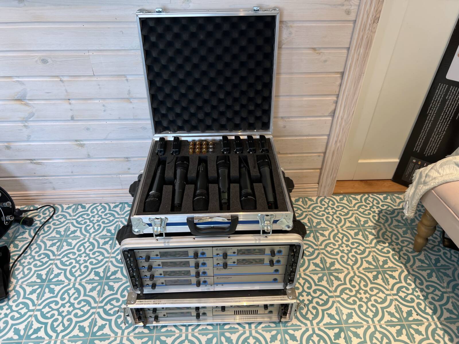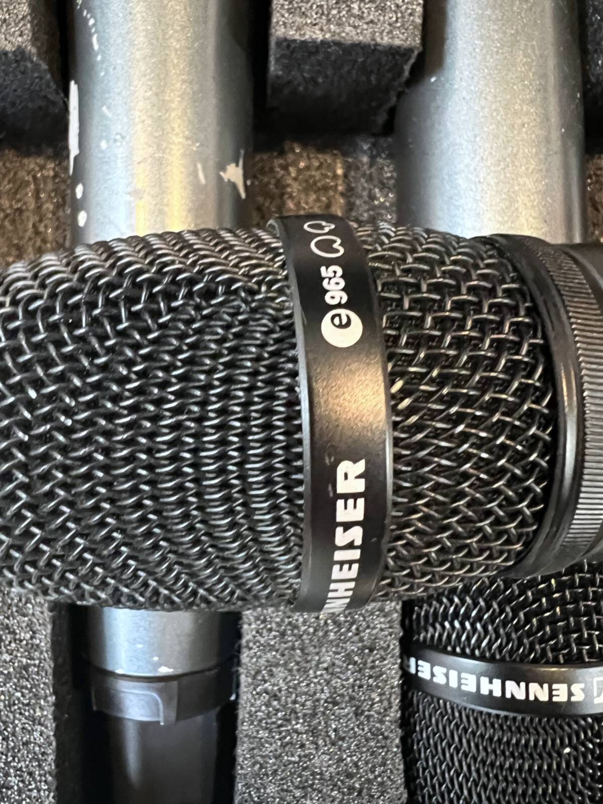 Includes multiple Sennheiser wireless microphones and receivers operating in the 560-610 MHz frequency range, with one receiver exhibiting glitches. Comes with an original Sennheiser blue case.
