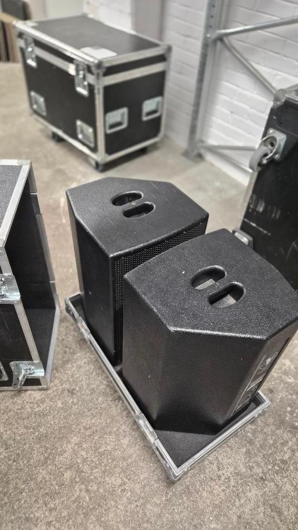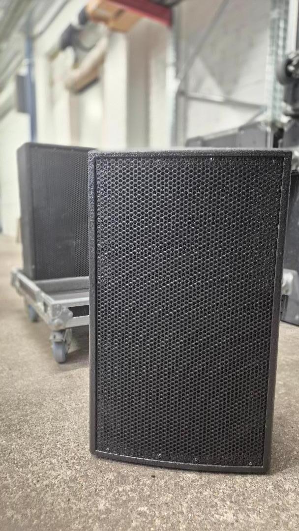 Gehäuse: Bassreflexkonstruktion aus 15 mm Multiplex, Strukturlackierung schwarz oder weiß, Hochständeflansch, 3 x M10 Gewindebuchse zur Bügelmontage, Tragegriff im Deckel 3 Gummifüße