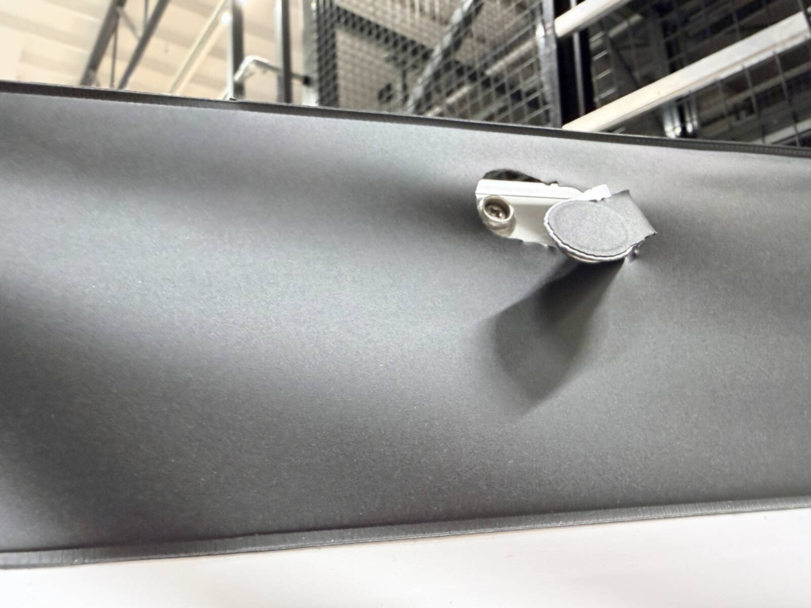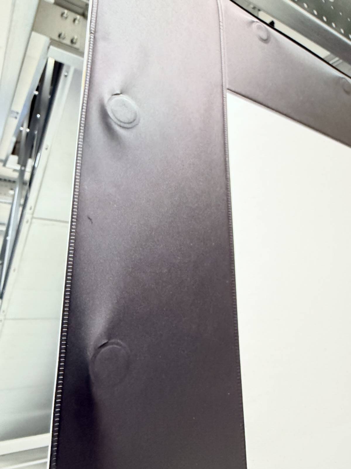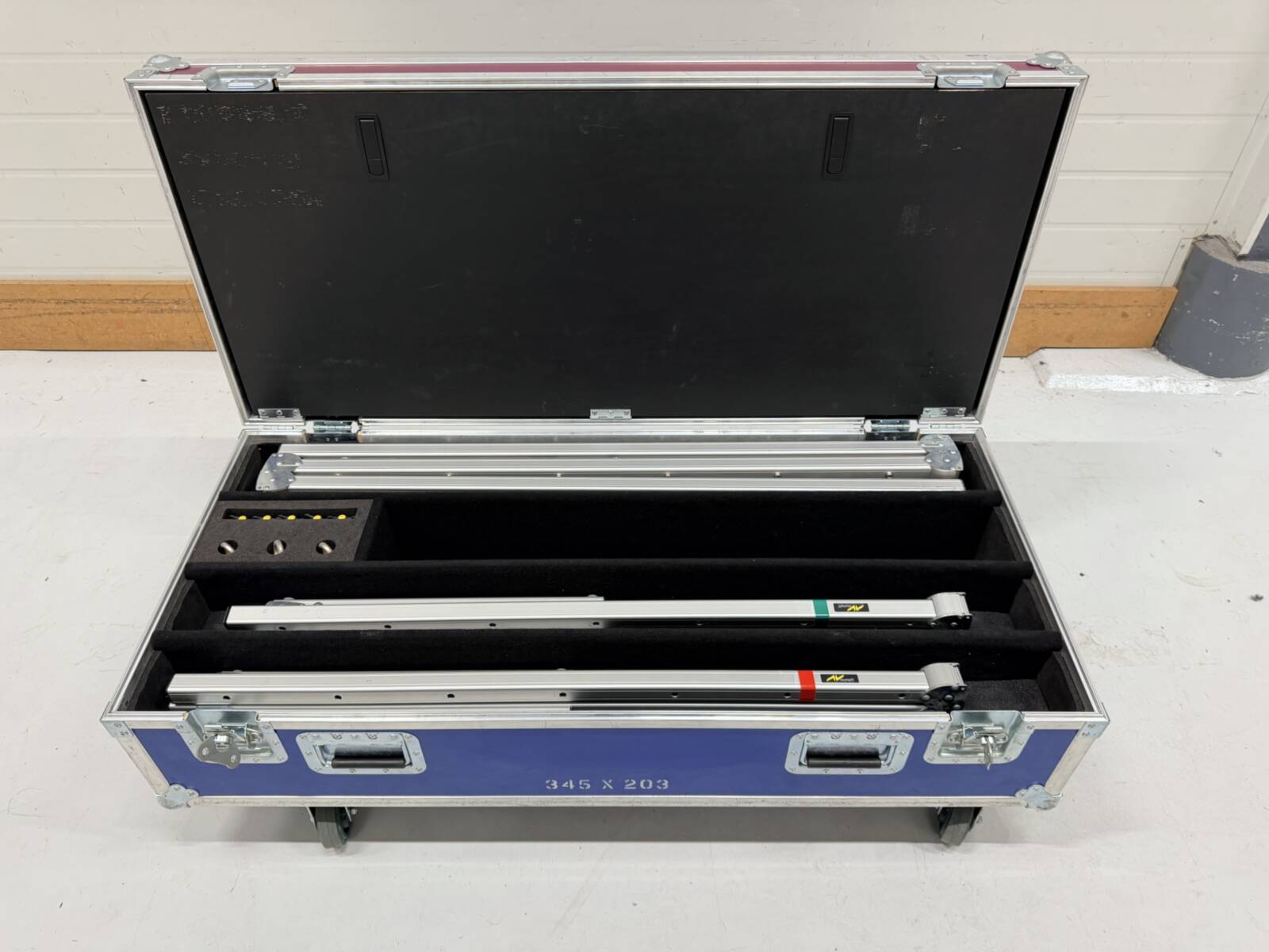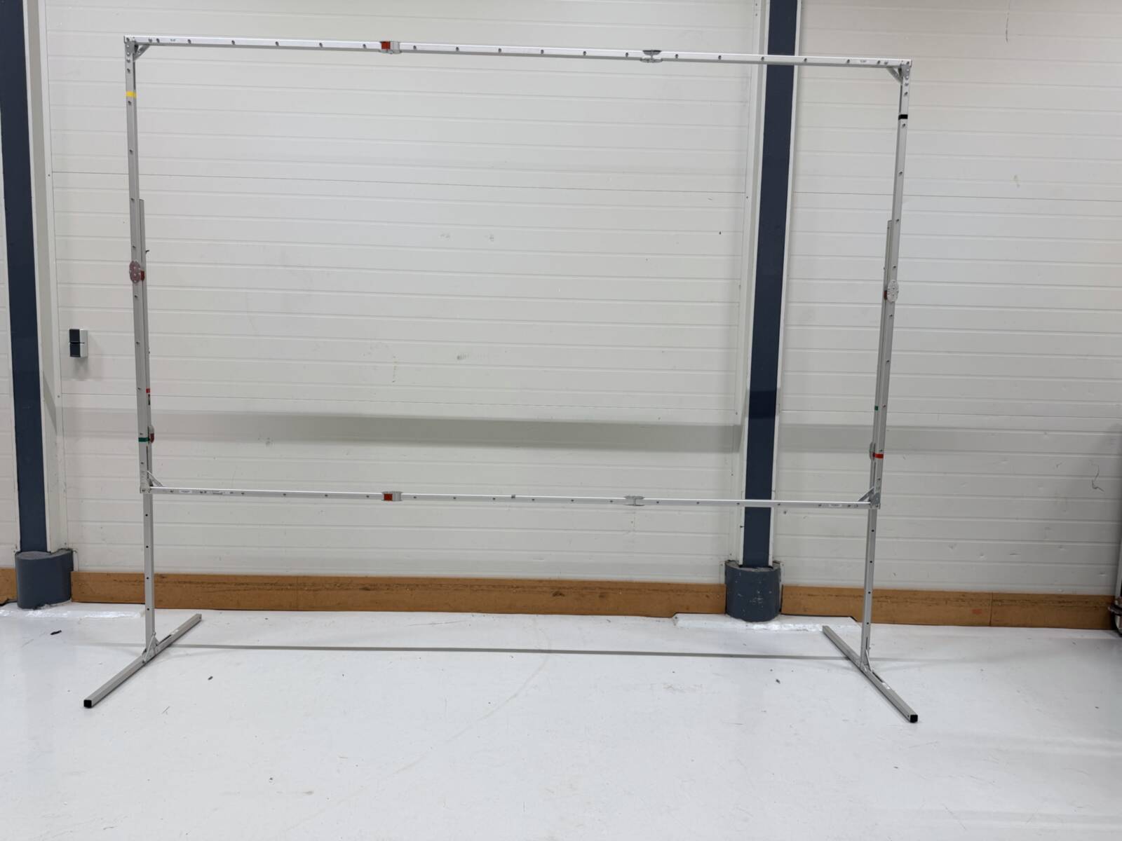 16:9 screen with a projection area of 325×183 cm, includes monoblox 32 frame, T-legs, front projection surface, and all required hardware. Some push buttons are damaged but the screen remains functional. The pictured case is not included, though it can be requested.