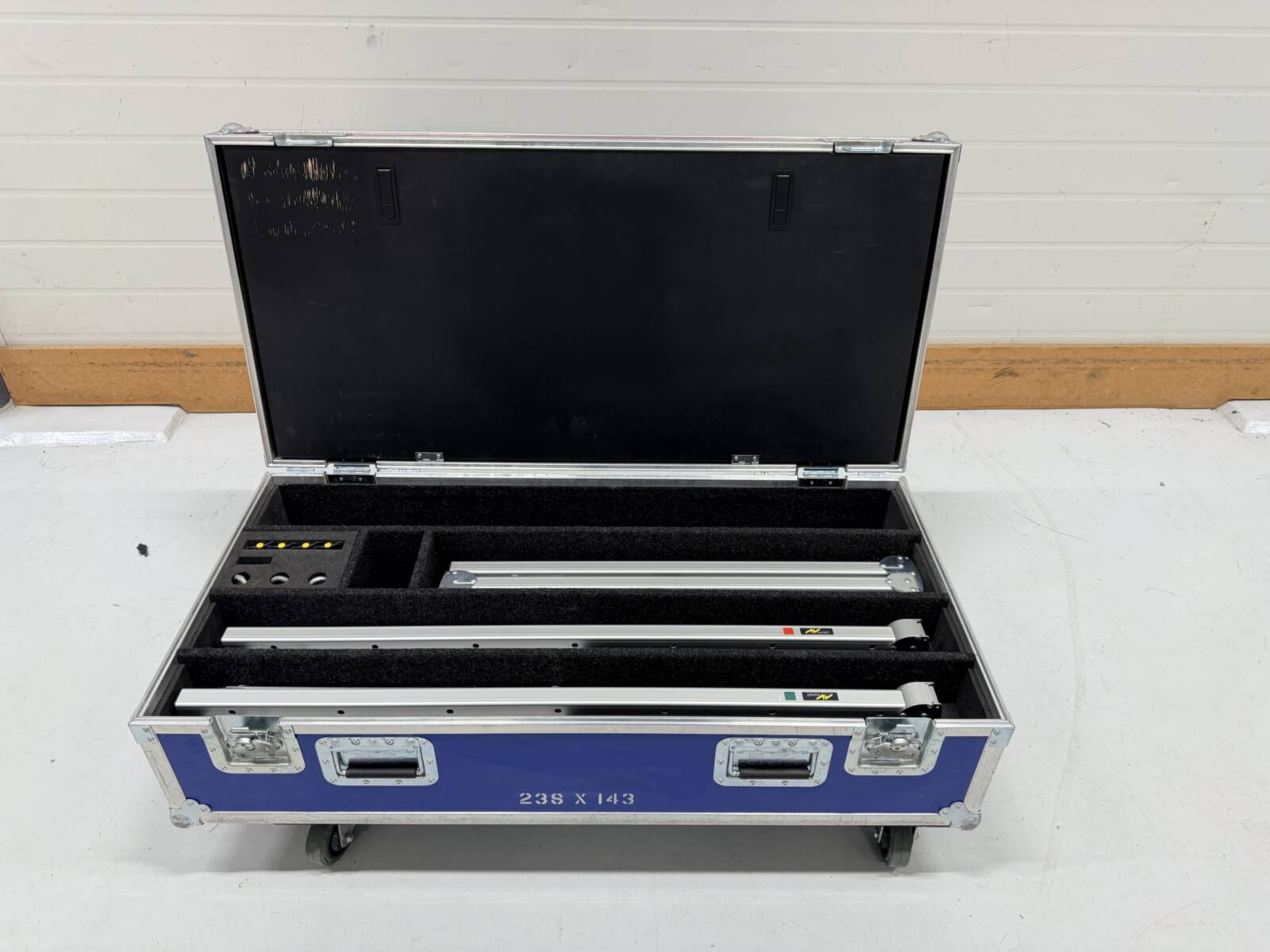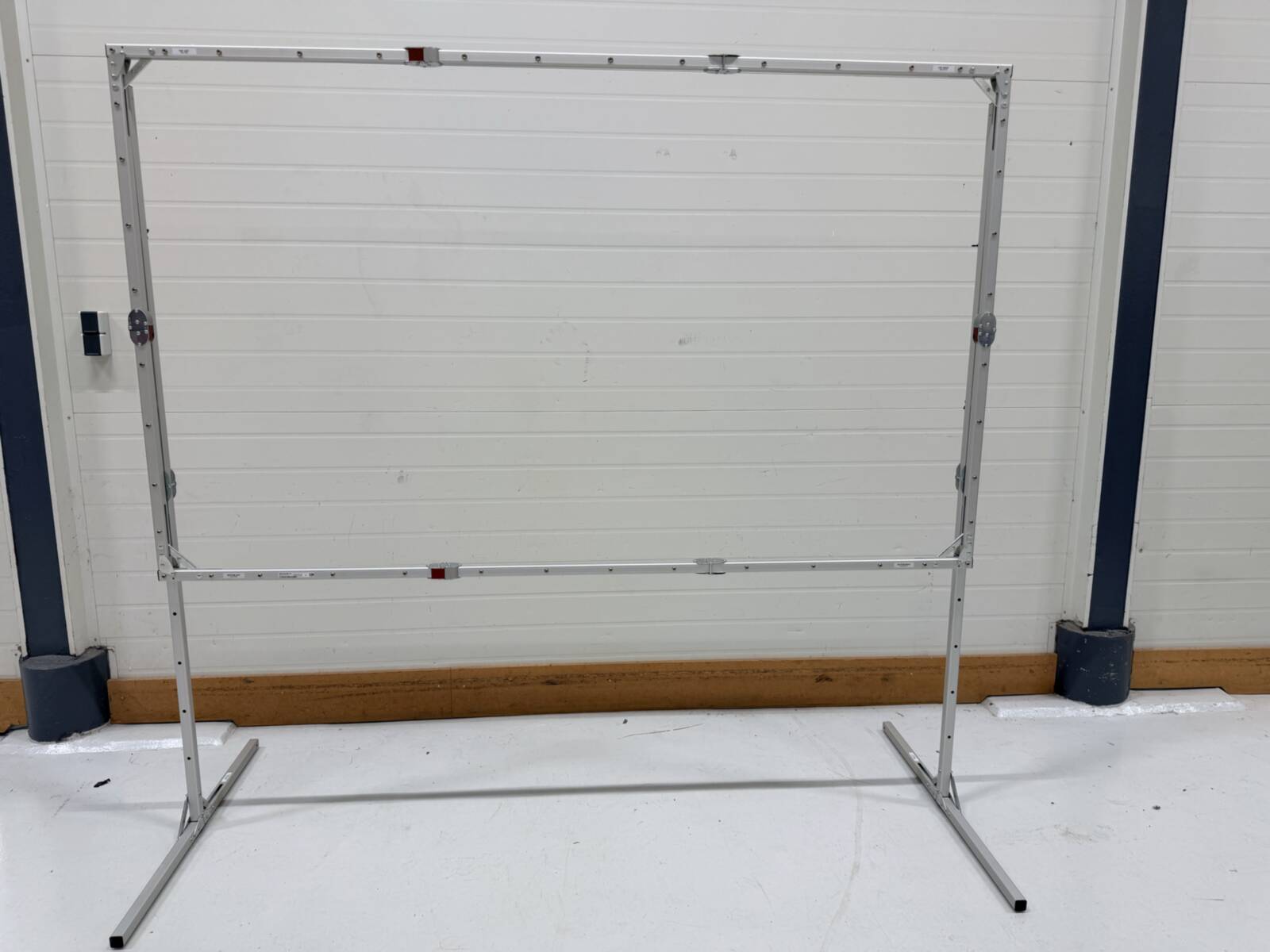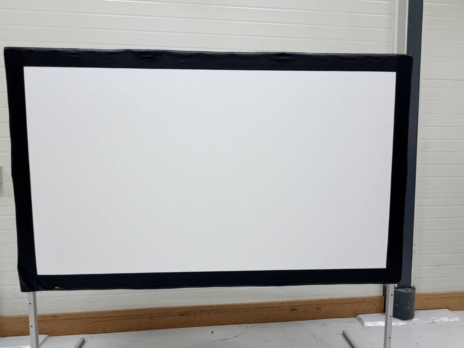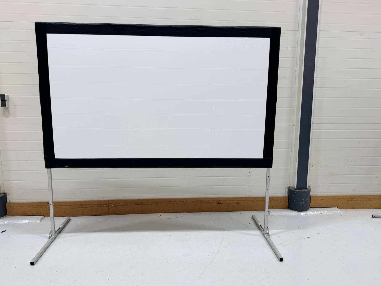 Durable 16:9 projection screen system with a 238×143 cm size and a 218×123 cm actual projection area, featuring a Monoblox 32 frame and T-legs. Includes a front projection screen and all required bolts and nuts. Case available separately upon request.