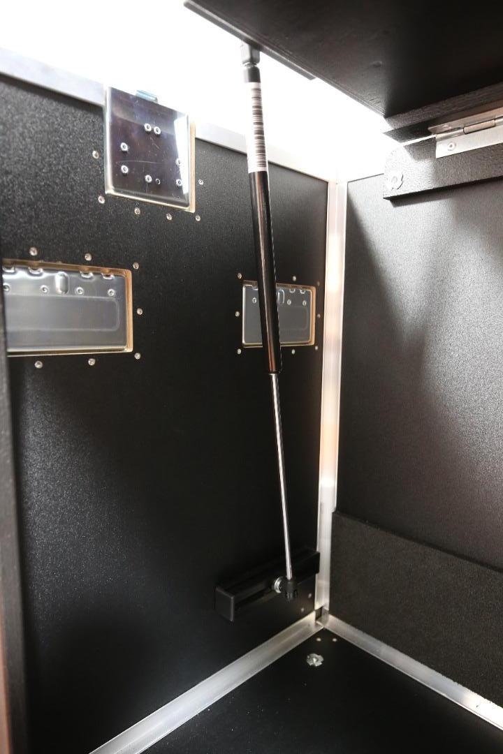 Im hinteren Bereich befindet sich eine geräumige Hundehütte. Dank eines Doppelscharniers lässt sich der Deckel der Hundehütte vollständig öffnen und bietet so eine großzügige Arbeitsfläche zum Anschließen von Steckern. Die Innenseite dieser Box besteht aus Birkensperrholz und ist komplett mit Warnex-Strukturlack lackiert.
