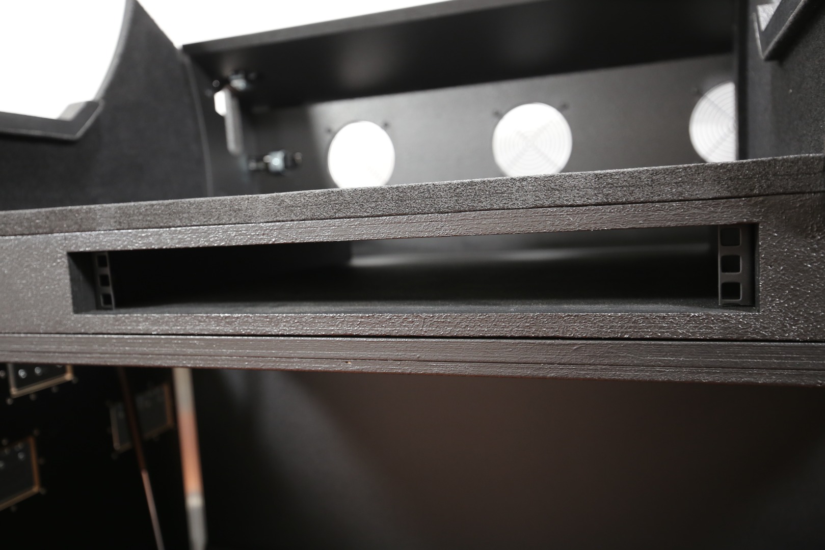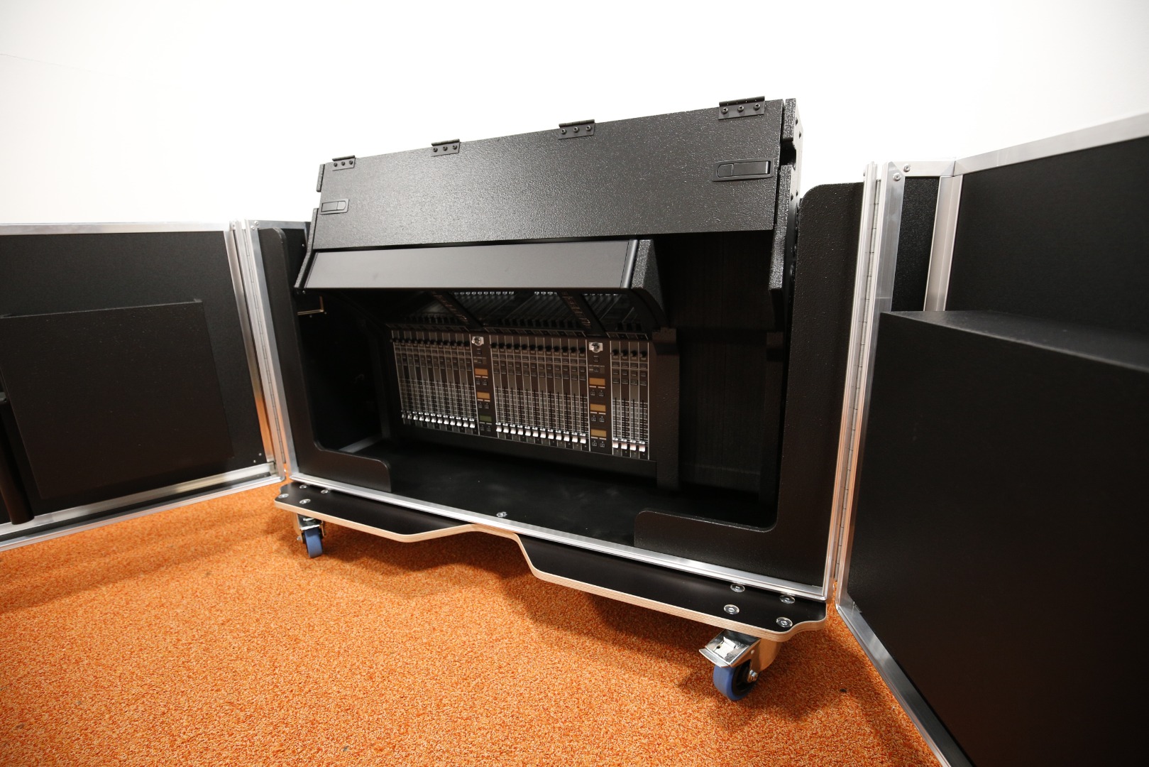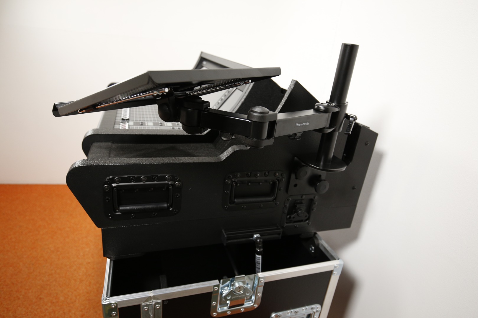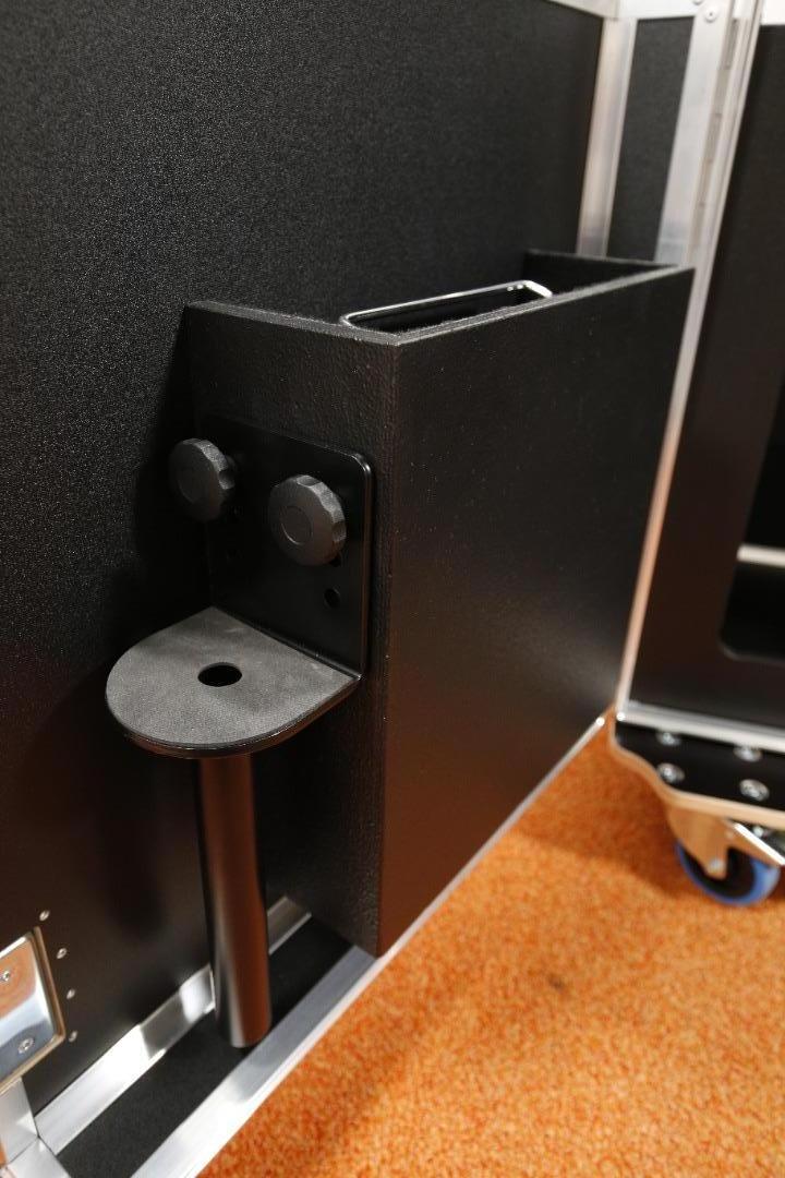 Dieses robuste Flightcase wurde speziell für das digitale Mischpult Yamaha DM7 entwickelt und bietet optimalen Platz für das Mischpult und die optionale Steuereinheit. Dank eines Klappsystems mit Gasdruckfedern lässt sich das Mischpult mühelos nach oben klappen und ist somit sofort einsatzbereit. Der Deckel ist mit zwei Eckgriffen ausgestattet, sodass das Flightcase problemlos von einer Person geöffnet werden kann. Unter dem Mischpult befindet sich ein 1HE-Fach mit Rackprofil zum Anschrauben von Peripheriegeräten. Dadurch befindet sich das Mischpult sofort in der idealen Arbeitshöhe. Eine Tür an der Vorderseite ermöglicht den Zugriff auf ein von außen zugängliches Staufach. Hinter der zweiten Tür befindet sich ein weiteres Staufach für Zubehör wie beispielsweise eine Halterung für einen zusätzlichen Bildschirm. Diese Halterung ist optional erhältlich.