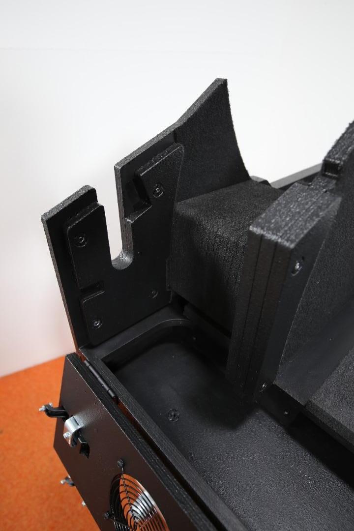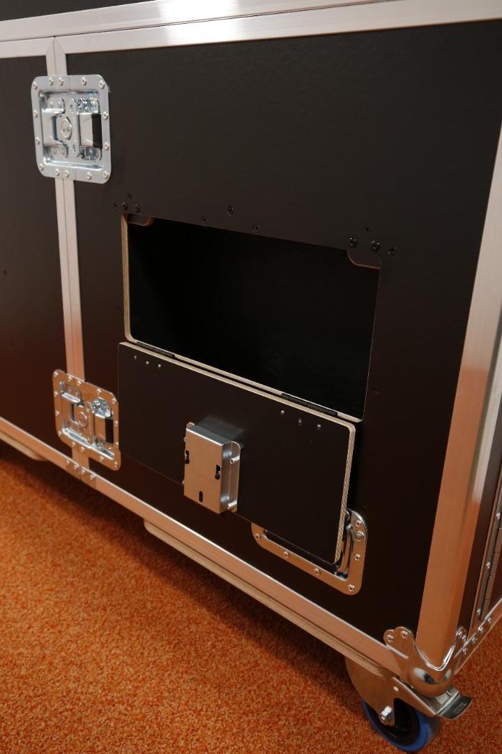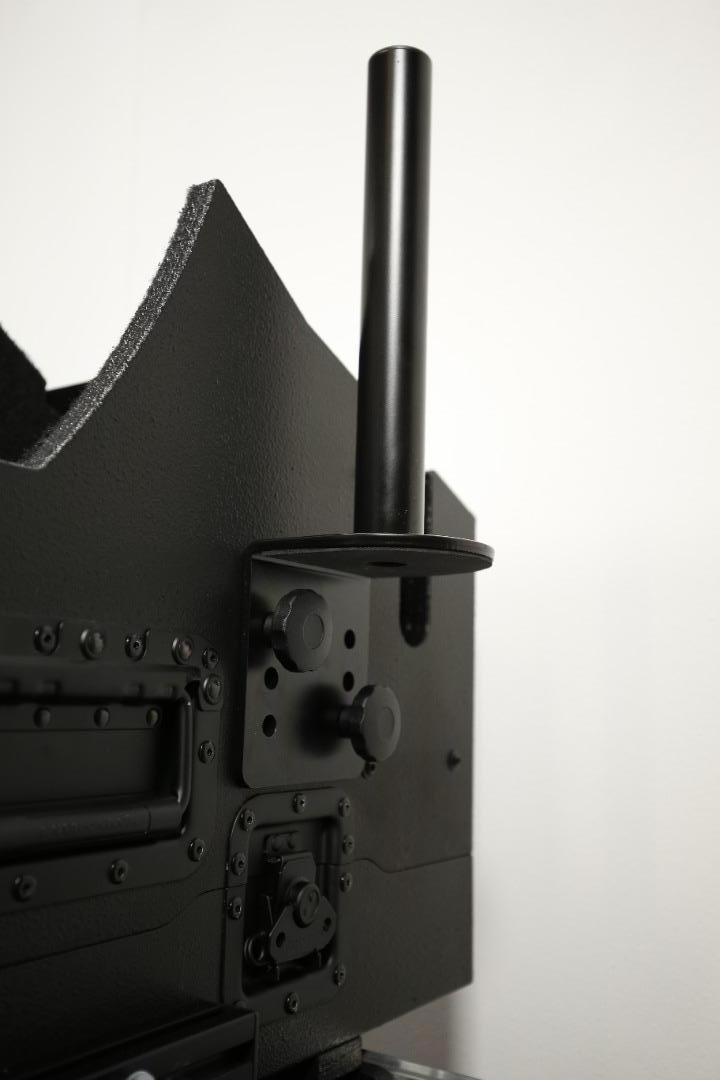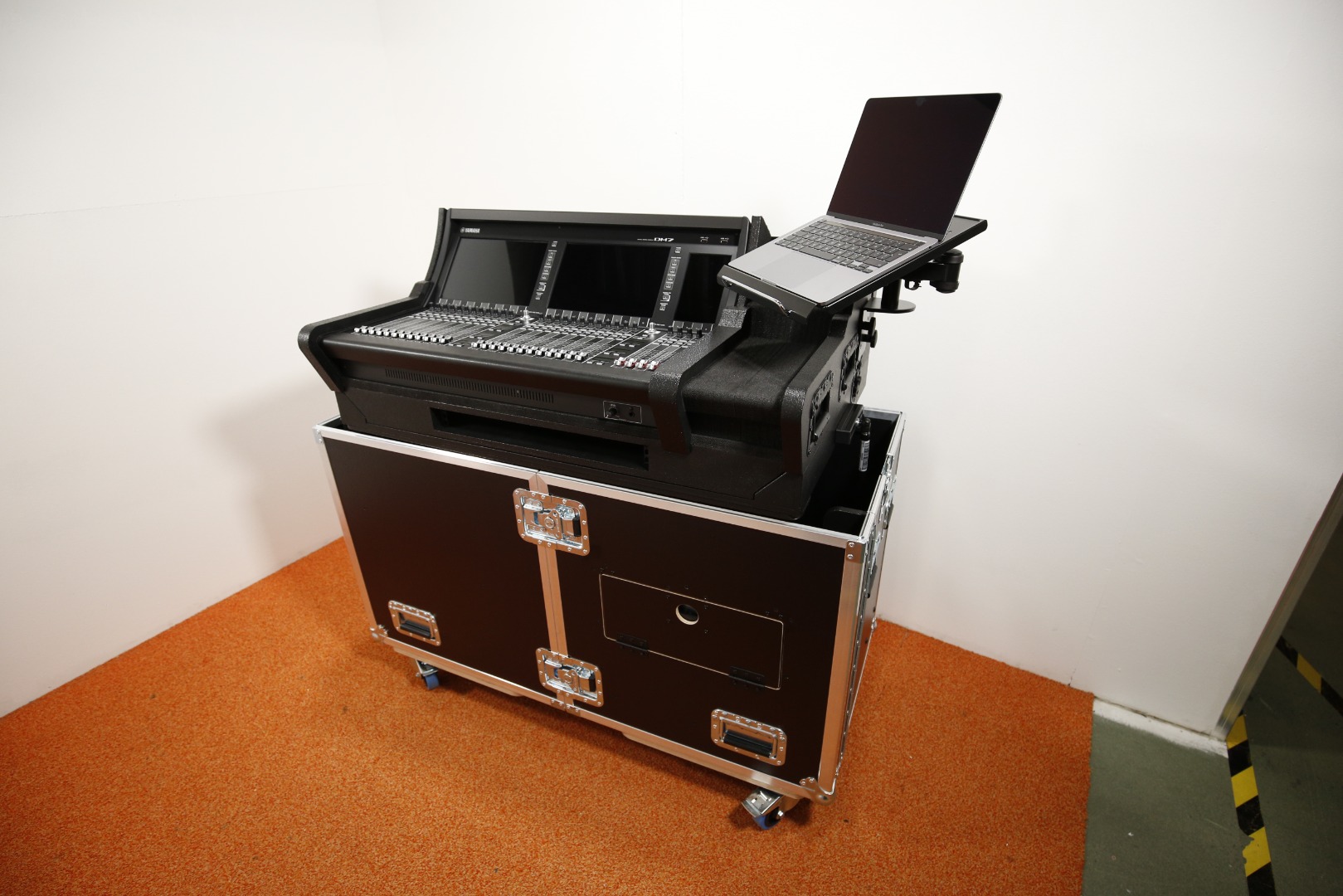 Dieses robuste Flightcase wurde speziell für das digitale Mischpult Yamaha DM7 entwickelt und bietet optimalen Platz für das Mischpult und die optionale Steuereinheit. Dank eines Klappsystems mit Gasdruckfedern lässt sich das Mischpult mühelos nach oben klappen und ist somit sofort einsatzbereit. Der Deckel ist mit zwei Eckgriffen ausgestattet, sodass das Flightcase problemlos von einer Person geöffnet werden kann. Unter dem Mischpult befindet sich ein 1HE-Fach mit Rackprofil zum Anschrauben von Peripheriegeräten. Dadurch befindet sich das Mischpult sofort in der idealen Arbeitshöhe. Eine Tür an der Vorderseite ermöglicht den Zugriff auf ein von außen zugängliches Staufach. Hinter der zweiten Tür befindet sich ein weiteres Staufach für Zubehör wie beispielsweise eine Halterung für einen zusätzlichen Bildschirm. Diese Halterung ist optional erhältlich.