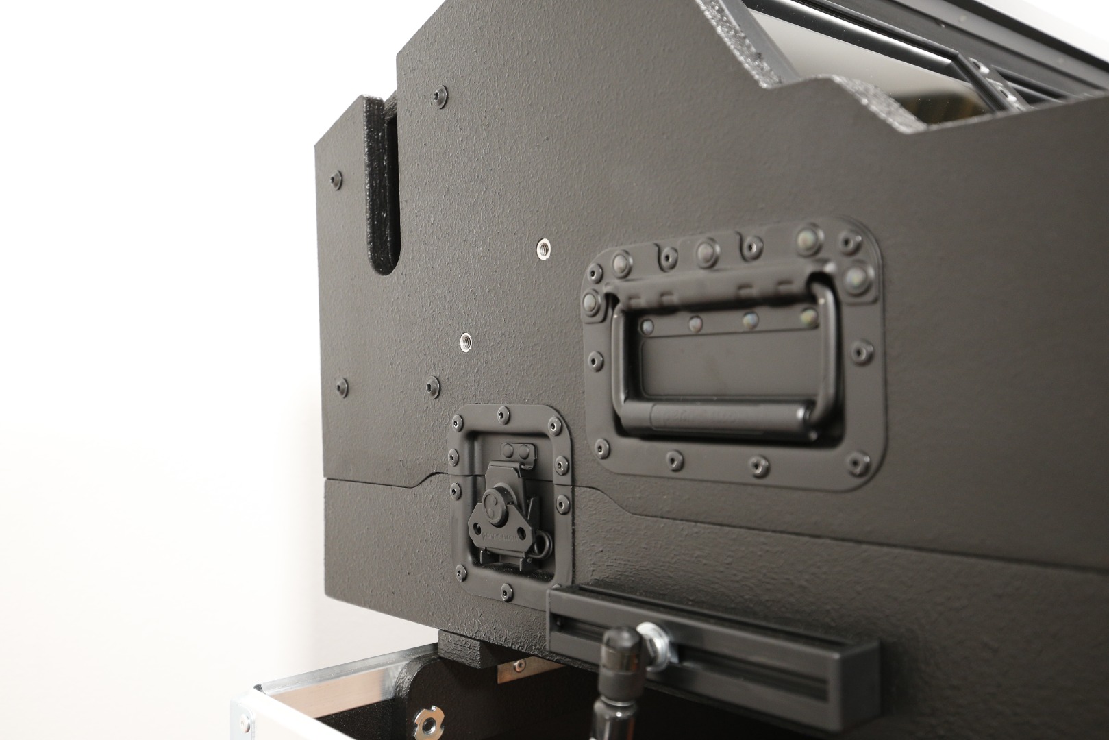 Dieses robuste Flightcase besteht aus 9 mm starkem Birken-Sperrholz und ist mit 1 mm starkem HPL und schwarzer Trägerfolie veredelt, was für ein elegantes Finish sorgt. Alle Beschläge stammen aus der Penn Elcom HD-Serie. Das Case ist mit einer 18-mm-Rollenplatte und vier Tente-Rollen ausgestattet, von denen zwei gebremst sind.