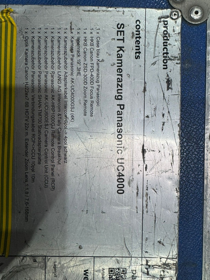 Zum Verkauf stehen zwei identische Broadcast Kamerazuege bestehend aus Panasonic AK UC4000 4K Studiokamera inklusive CCU RCP Canon Broadcast Optik sowie Stativsystem und umfangreichem Zubehoer
