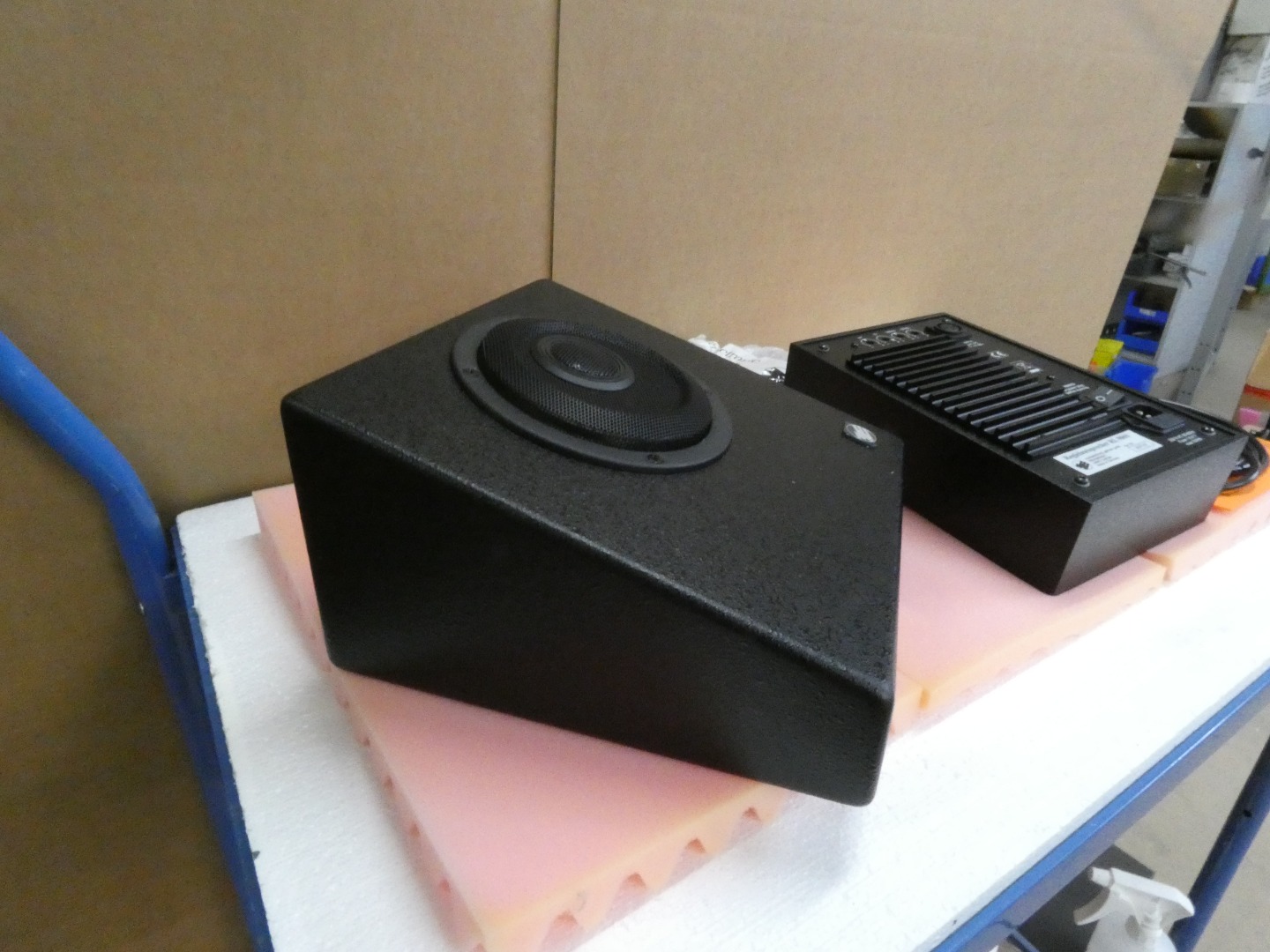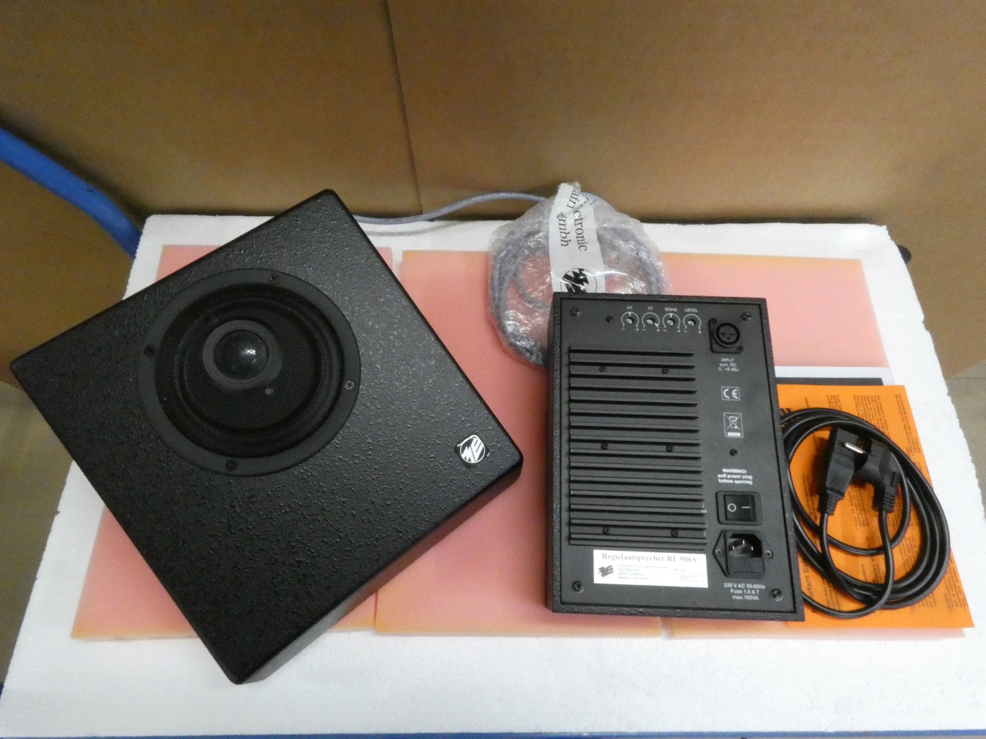 Regielautsprecher RL906-S - Mattlack schwarz - Sonderanfertigung für Ü-Wageneinbau, angeschrägtem Gehäuse. abgesetzten Verstärker (3m Verbindungskabel)