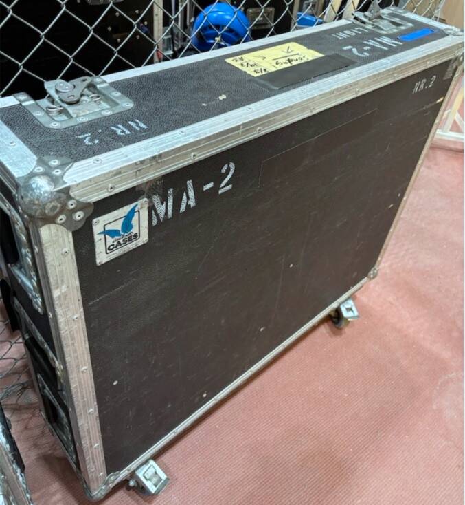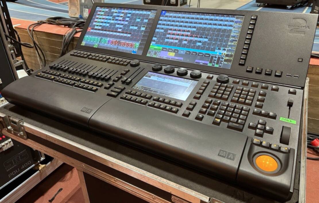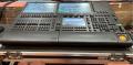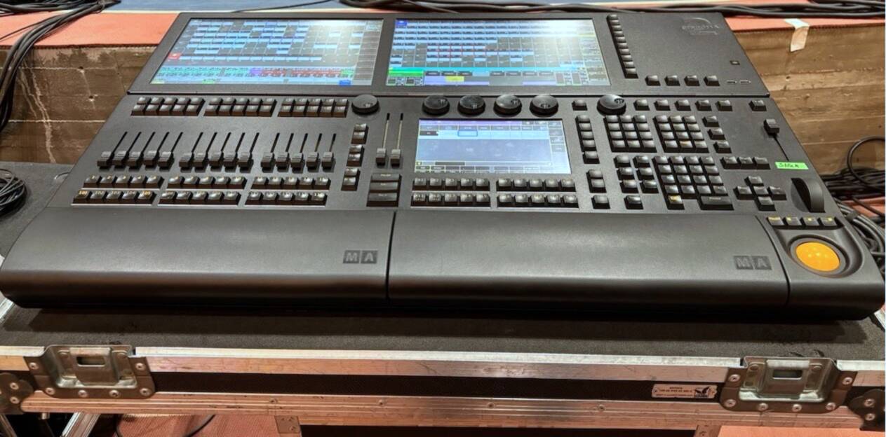 Professional lighting control desk previously used exclusively for corporate events, featuring visible paint scratches but maintained in functional condition. Includes flight case, dust cover, two LED gooseneck lamps, and a power cable, making it ready for use in various event settings.