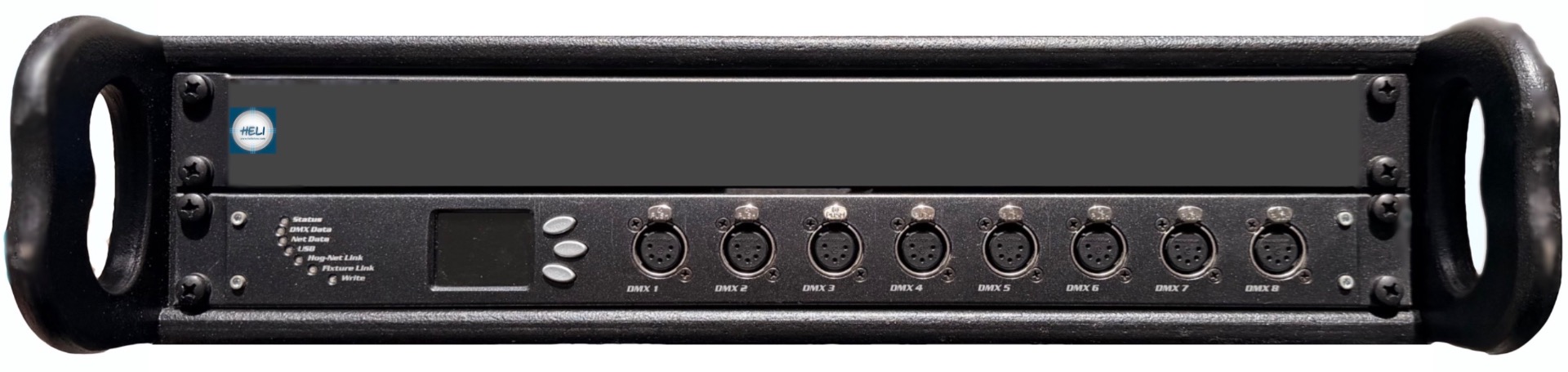 Diese DMX Prozessoren (DP8000) verarbeiten alle showrelevanten Daten und stellen diese in Form von bis zu 16 DMX, Art-Net und E1.3.1 (sACN) Universen zur Verfügung. Nur nebenbei: die Hog 4 Betriebssoftware ist selbst nicht limitiert in der Anzahl maximaler DMX Kanäle. Die Anzahl eingesetzter DMX Prozessoren bestimmt die Anzahl der zur Verfügung gestellten DMX Universen für eine Show.