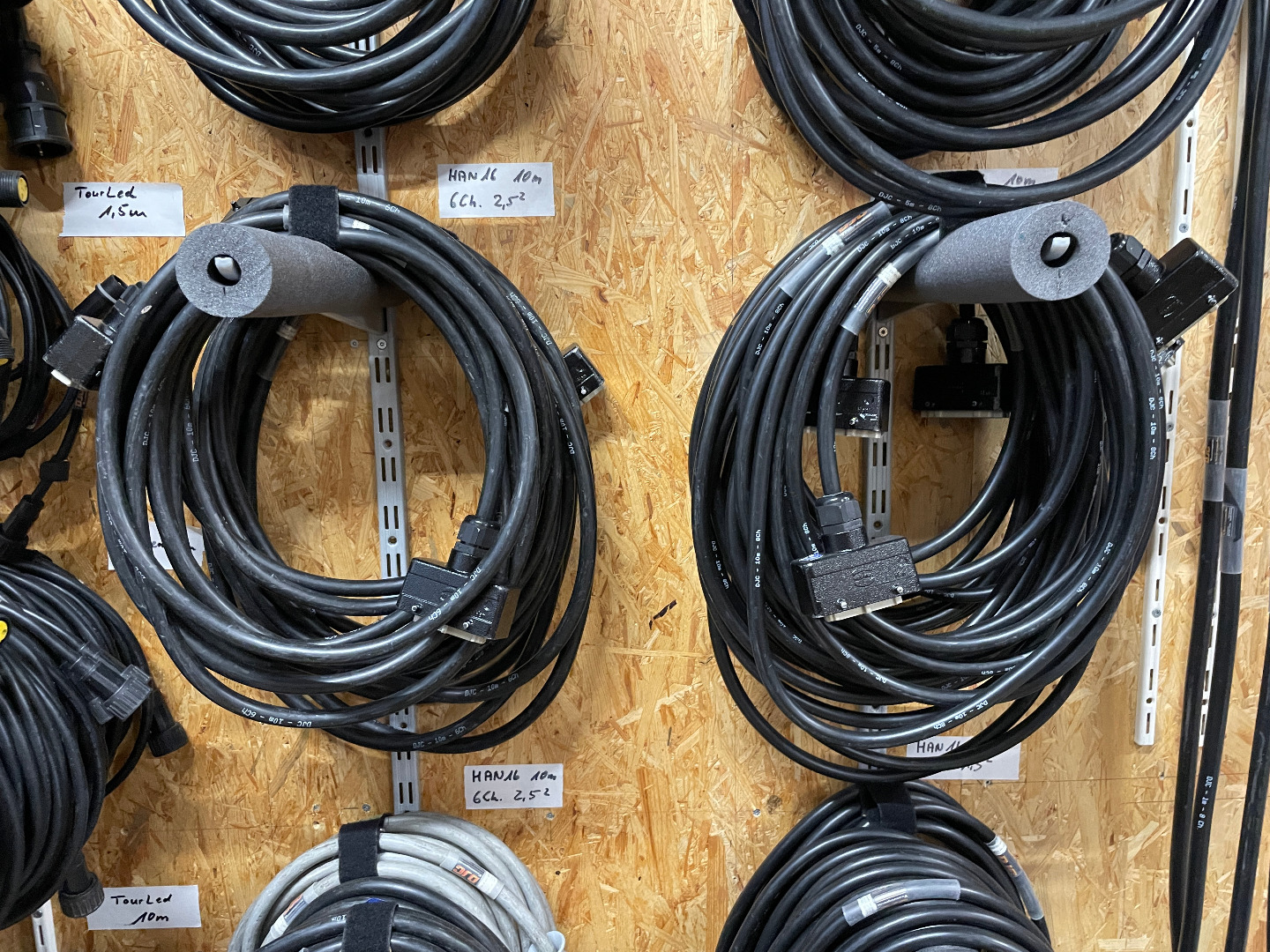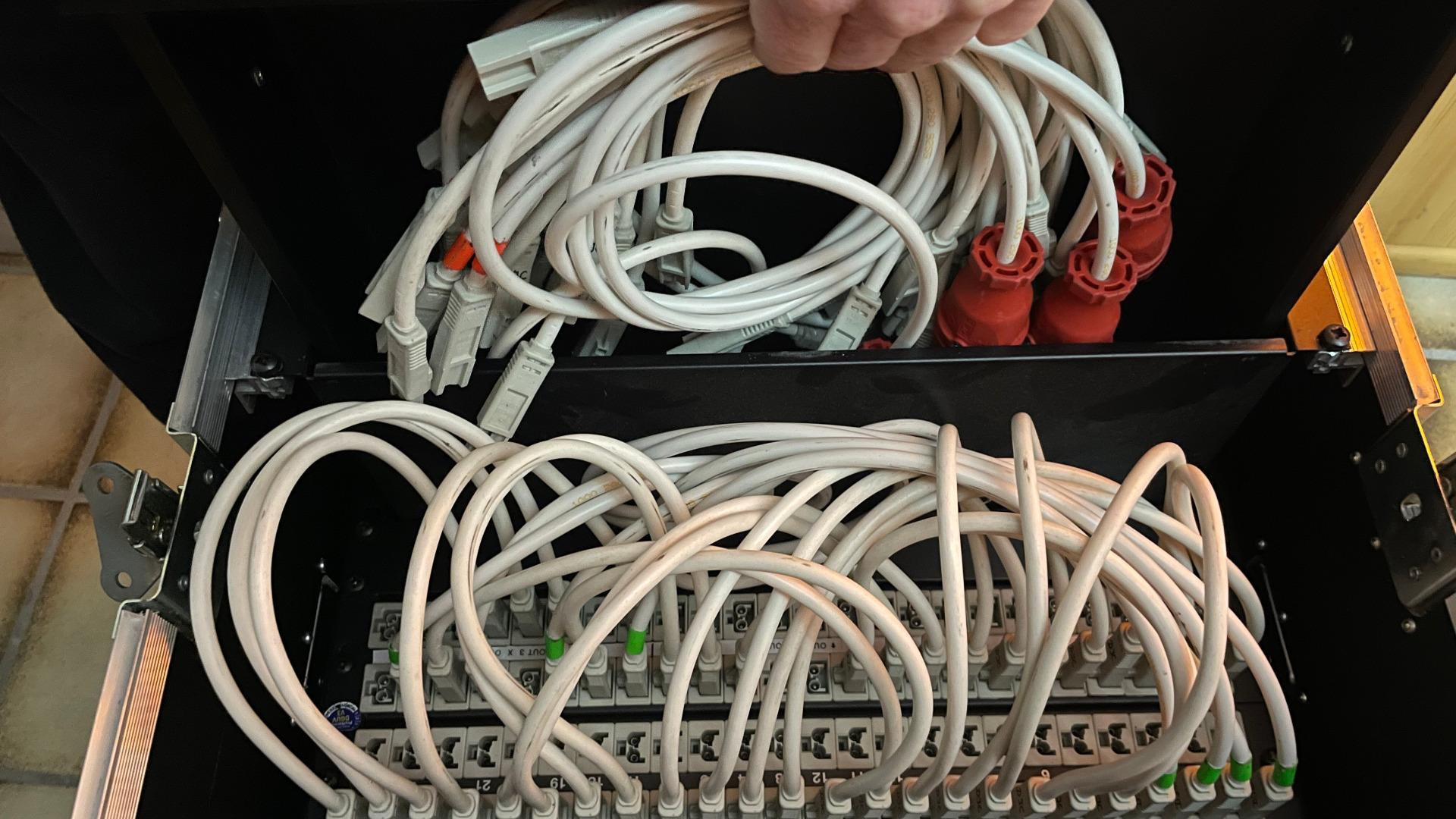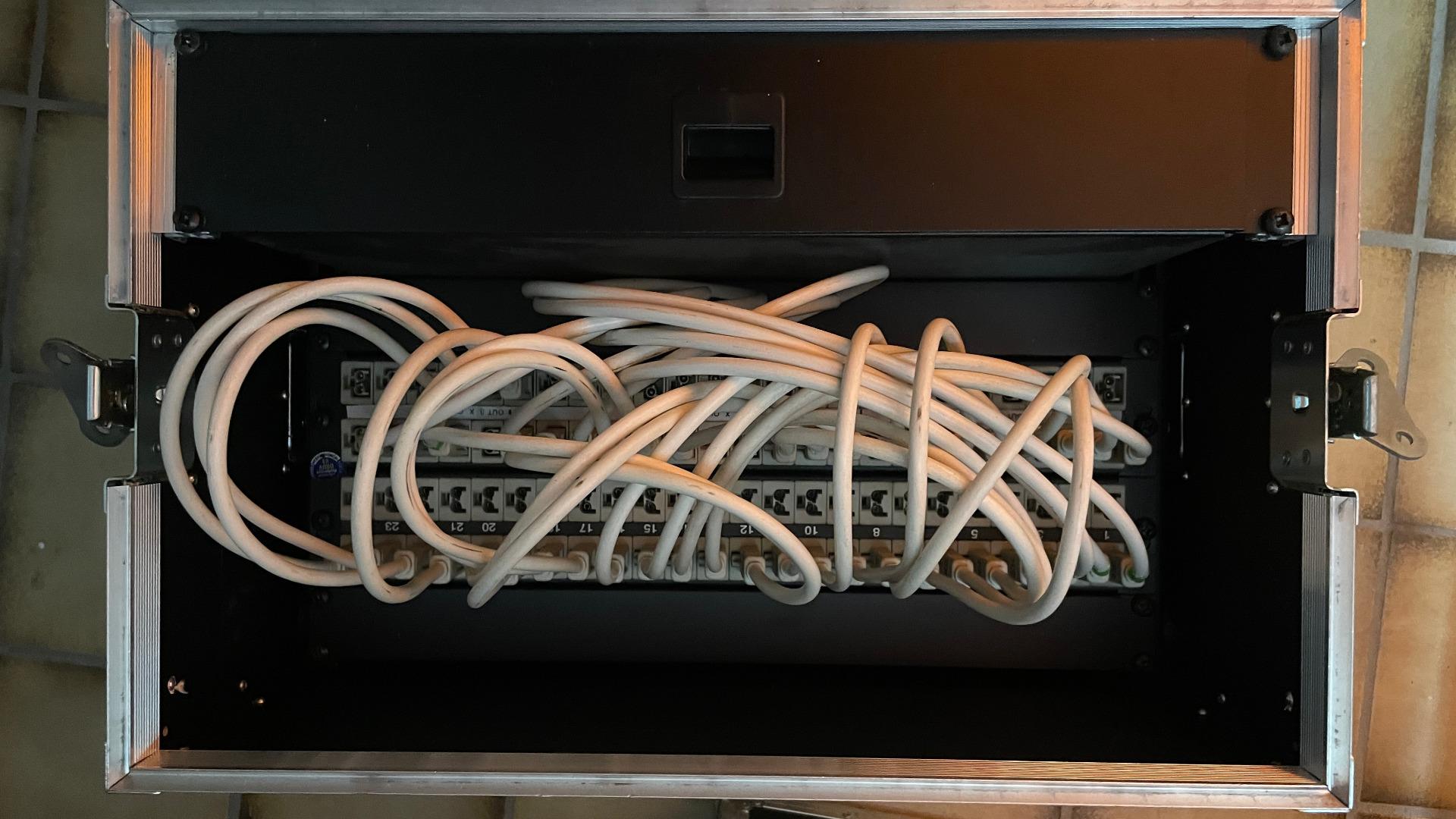 Es sind insgesamt 48 HP-Kabel dabei. Grüne Markierung lange HP-Kabel. 4 Adapter Schuko Stecker auf HP Stecker mit roter Markierung. Zur Aufbewahrung ist eine 2HE Stahlschublade im CCP Case.