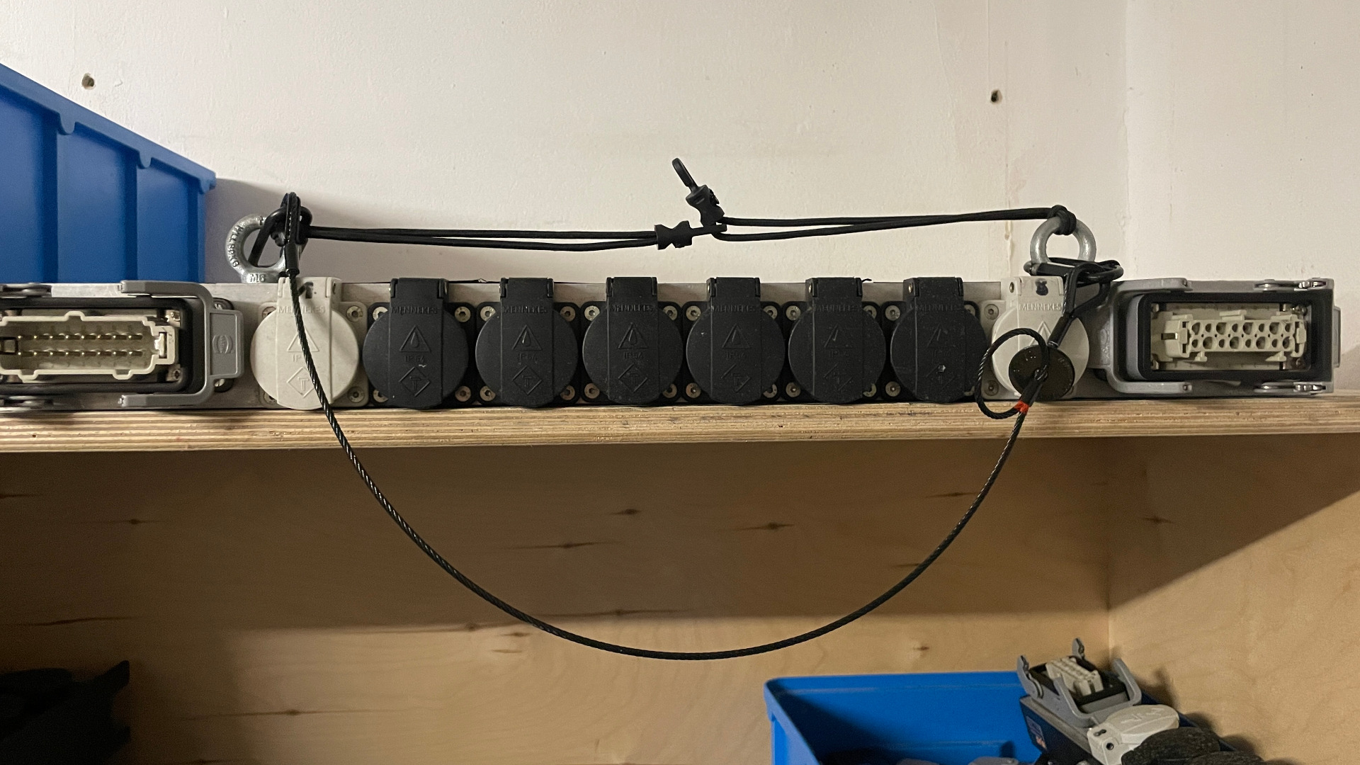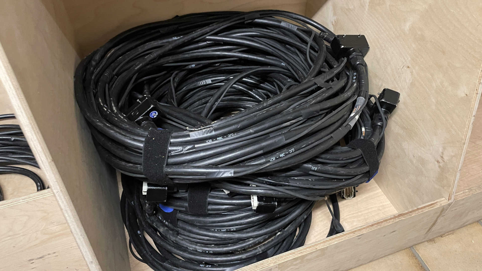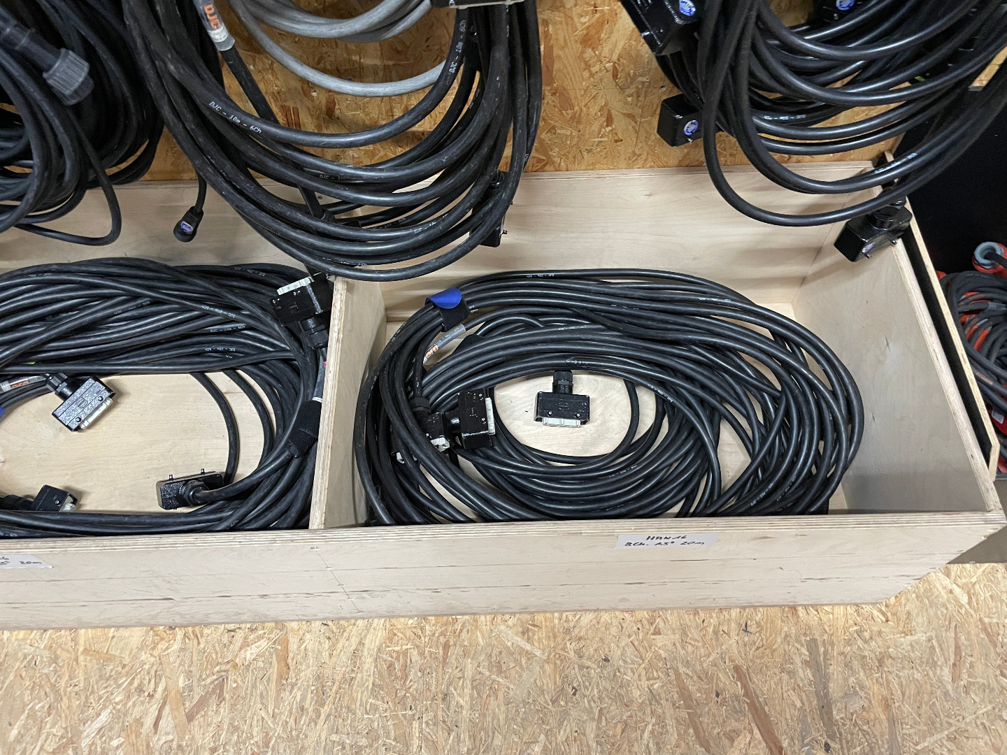 Es sind insgesamt 48 HP-Kabel dabei. Grüne Markierung lange HP-Kabel. 4 Adapter Schuko Stecker auf HP Stecker mit roter Markierung. Zur Aufbewahrung ist eine 2HE Stahlschublade im CCP Case.