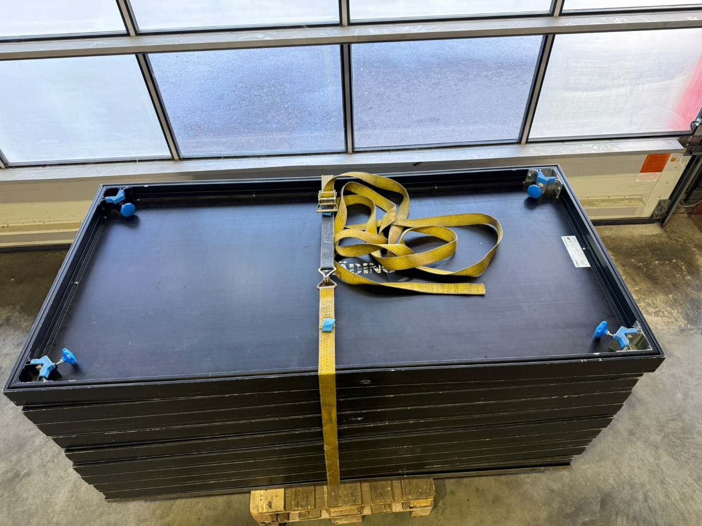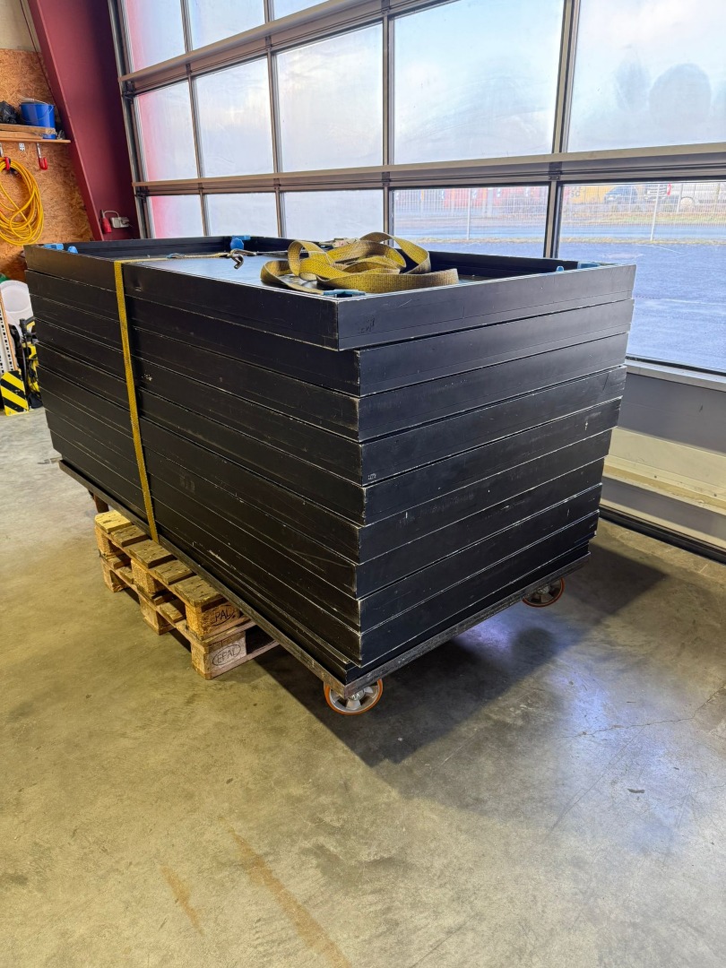 Wir bieten 12x Bühnenpodeste 2m*1m aus 2024 mit dunkler Siebdruckplatte und schwarzem Rahmen.