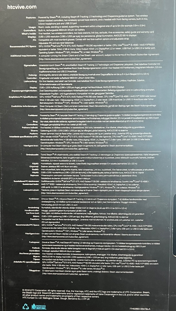 Unterstützt durch Steam ®VR, einschließlich SteamVR Tracking 1.0 Technologie und Chaperone Leitsystem. Zwei kabellose Controller mit Bewegungsverfolgung, zwei kabellose Room Scale Bewegungssensoren und ein Vive Headset mit Frontkamera, integrierter Mikrofon, 3,5 mm Kopfhöreranschluss und USB 2.0 Anschluss