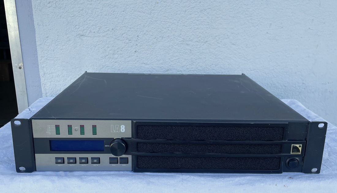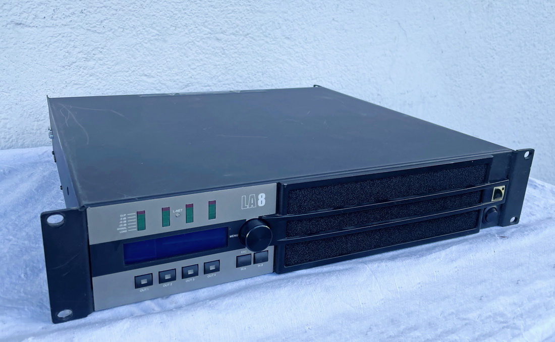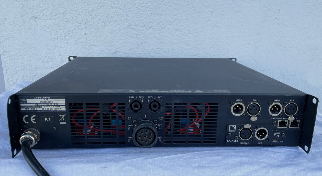 4-channel system power amplifier with L-Acoustics set ups, universal switching PSU supply 120 - 230V, 4 x 1100W / 8 Ω at 1% THD, all channels driven, (4 x 1300W peak power) Amplifier Gain = 32 dB, 2U/19" R3 Version with AES/EBU card