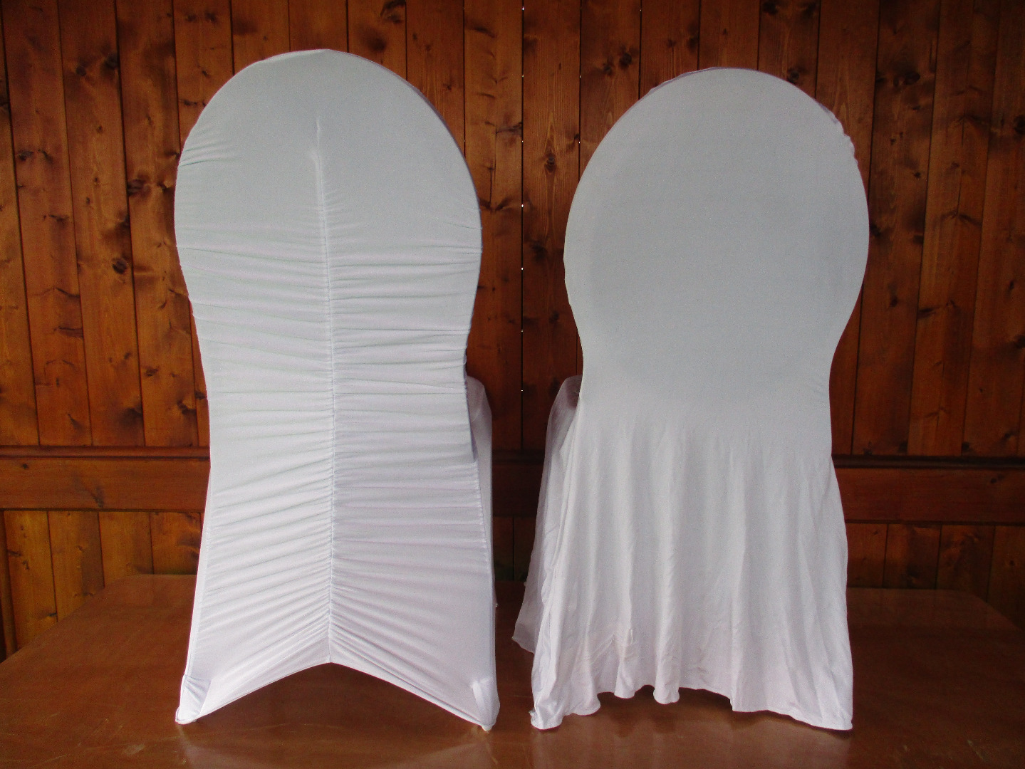 weiß, Stretch; nur für Stühle ohne Armlehne geeignet, entweder glatt hängend oder mit Fischgrätenmuster hinten