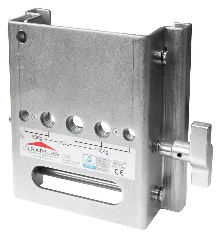 Mit dieser Clamp können Sie an Standard-Kederprofilen (Aluminium Zelträger) mit maximaler Breite von 100mm Ihre Traversen und weitere Technik befestigen. Über die verschiedenen Befestigungsmöglichkeiten von M10/M12/M14 können bis zu 150kg Last verteilt werden.