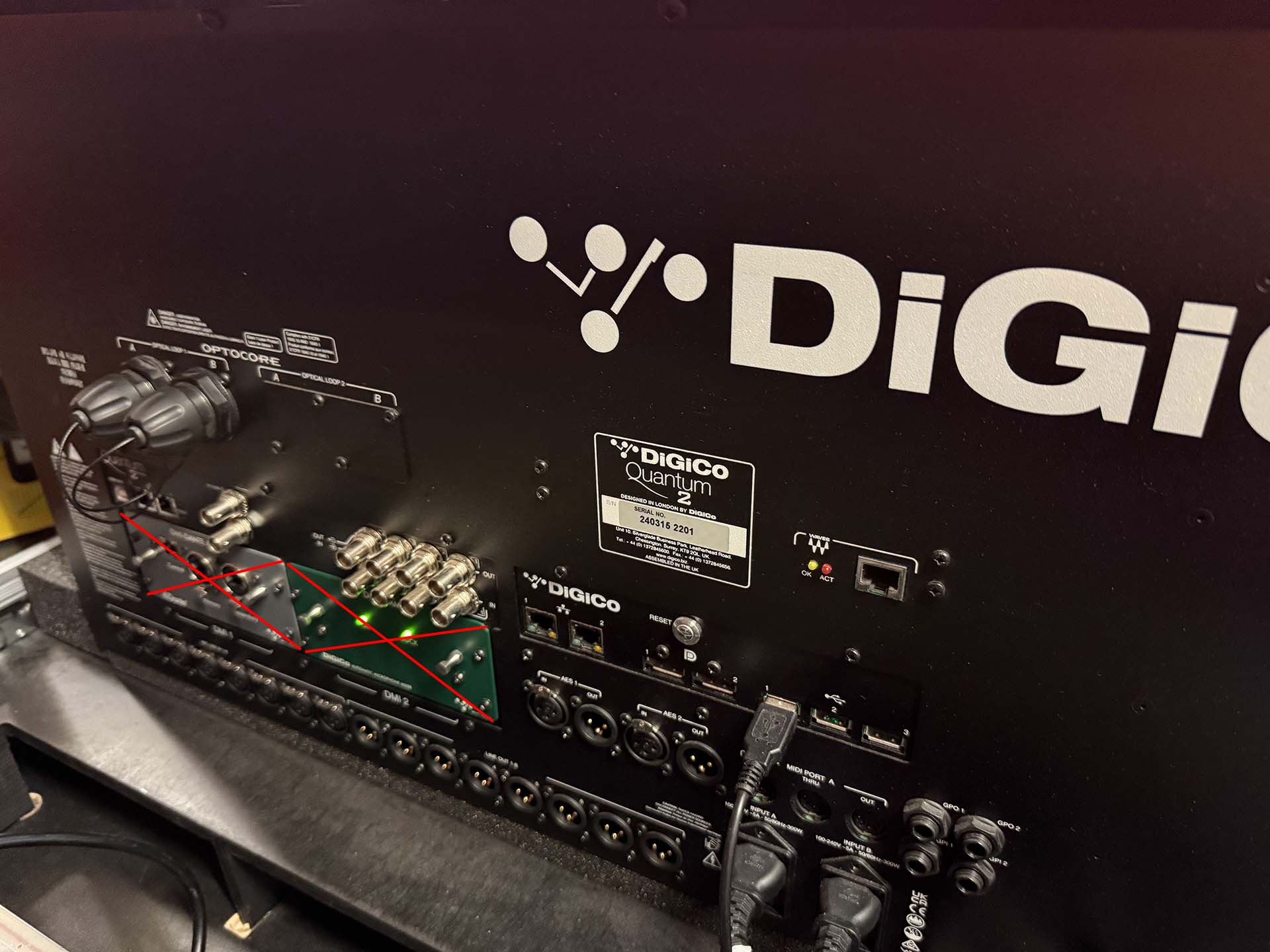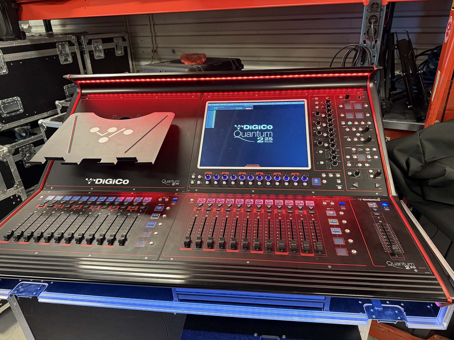 Digital mixing console package including Optocore, Waves port, Pulse upgrade, custom case, and laptop tray, all designed for professional audio control and connectivity in live or studio applications.