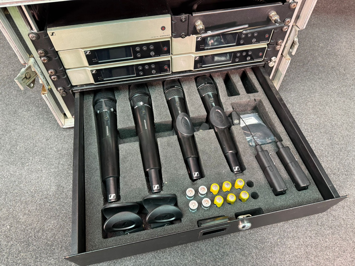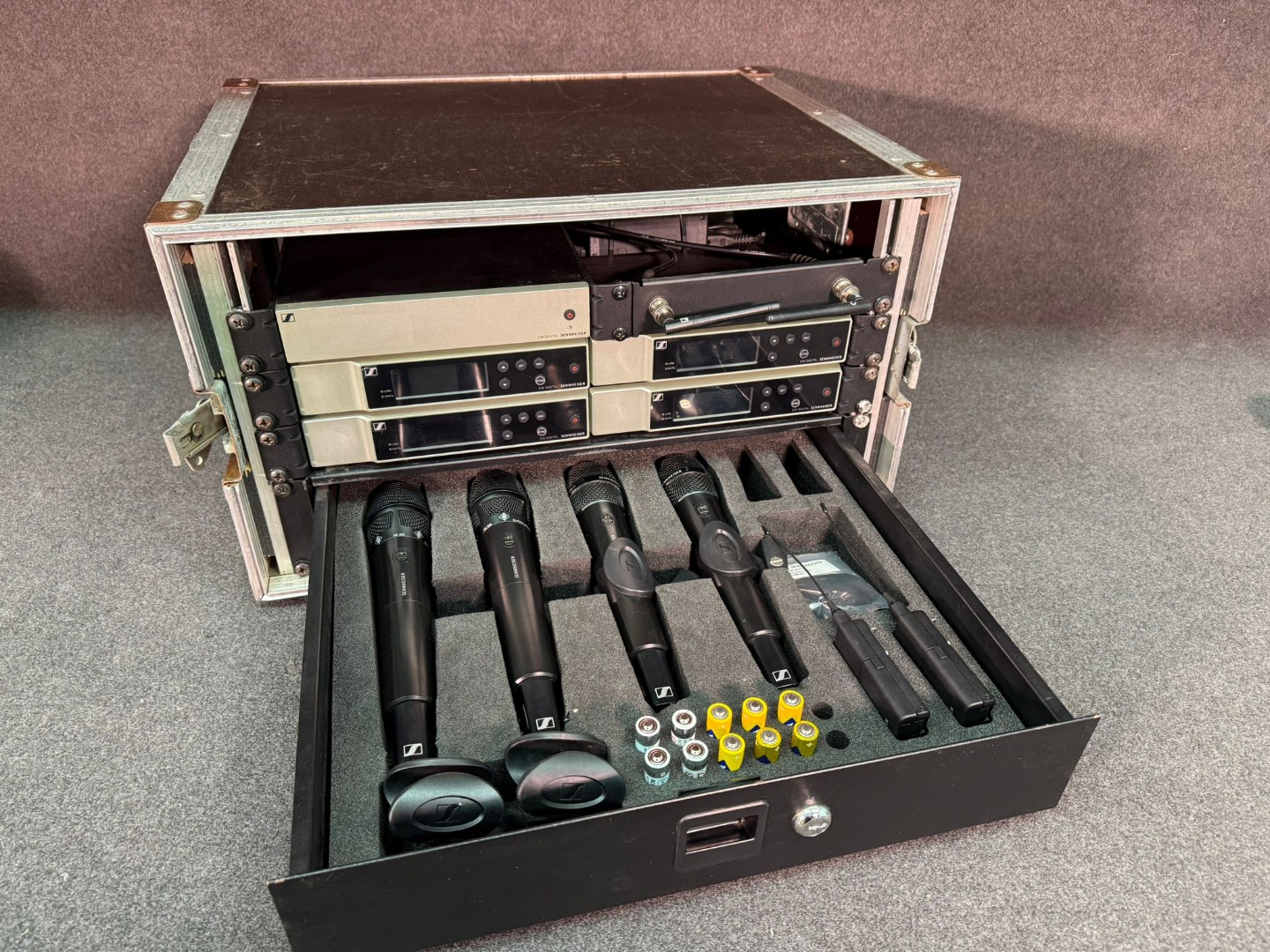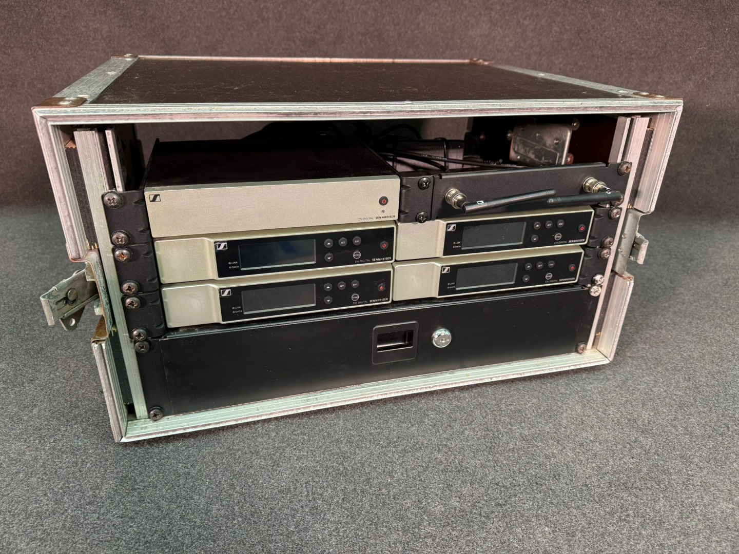 Außerdem gibt es ein passendes Rack, Schublade mit gefrästen Inlay dazu. Diverse Zubehörteile werden im Karton mitgeliefert (restl. Netzteile, Poppschutz, Verbindungs und Adapterplatten, Antennen usw.)
