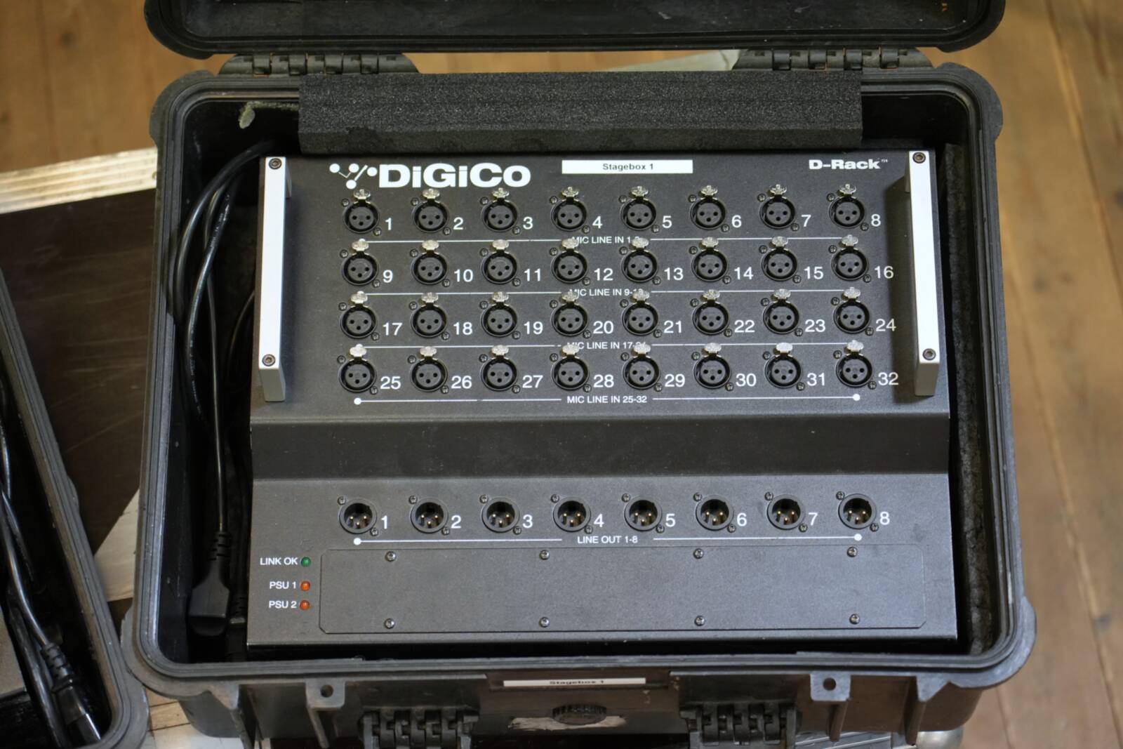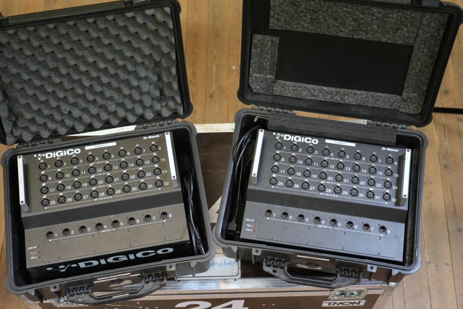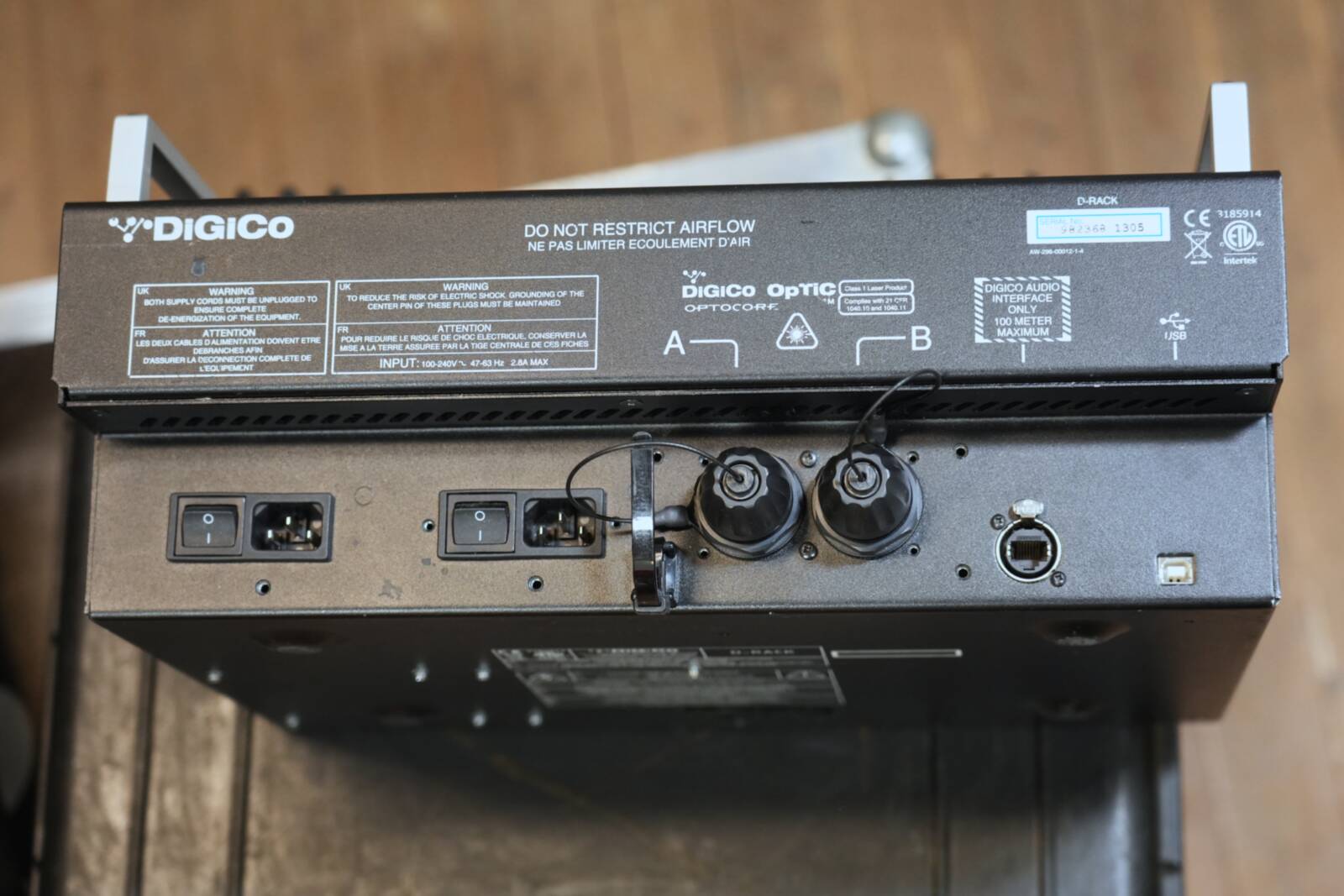 Digital rack system equipped with three 150-meter Optocore fiber drums, suitable for professional audio setups requiring extensive connectivity and reliable fiber distribution.