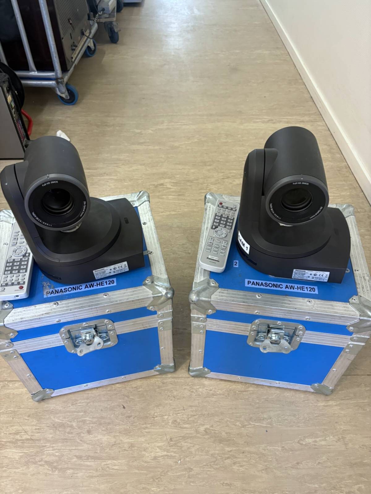 Includes two Panasonic HE AW 120 units, two remotes, and two power supply units, suitable for video production setups requiring multi-camera control and accessories.