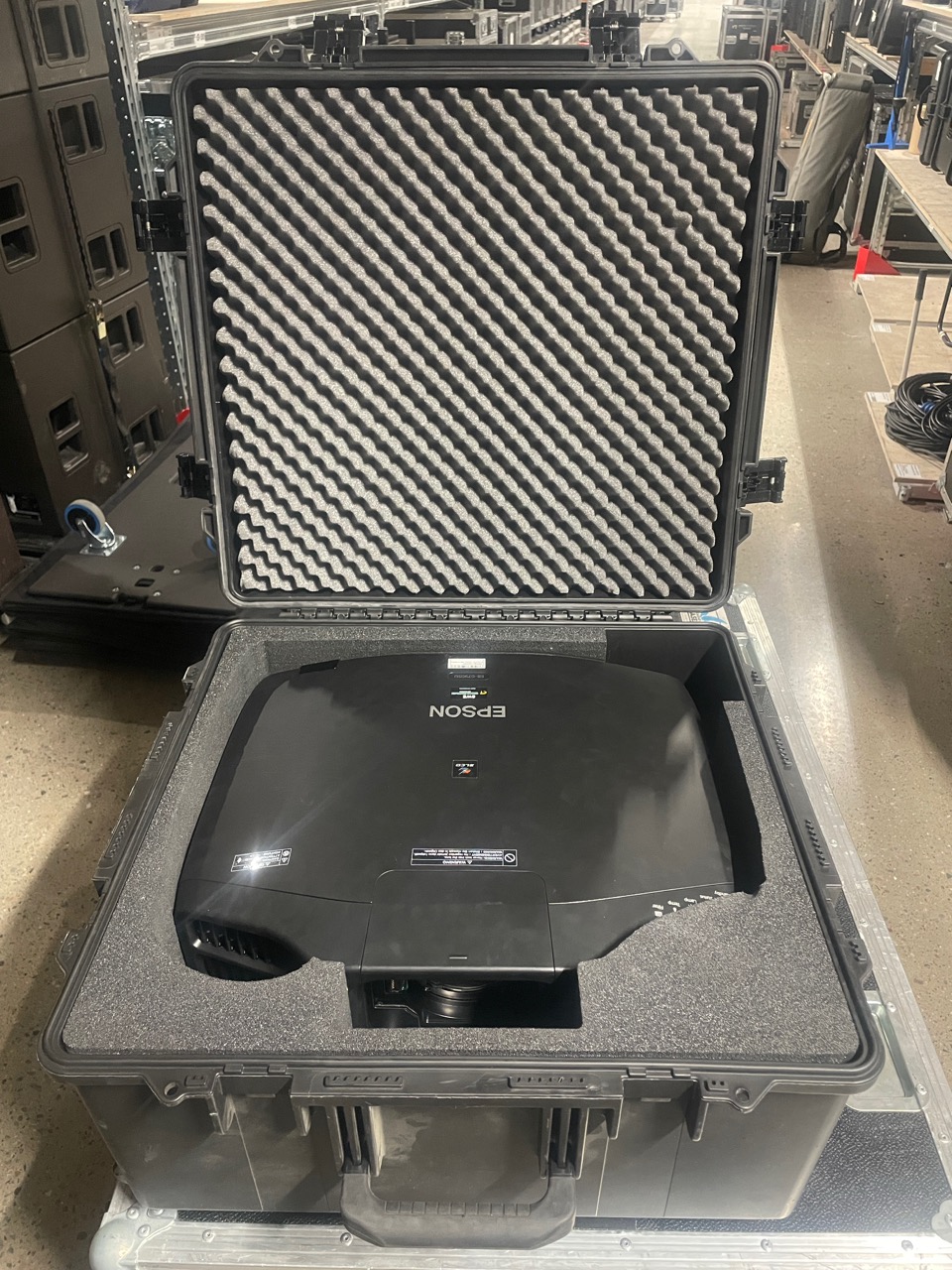High brightness Epson projector supplied in a protective case, ideal for professional video and presentation applications.