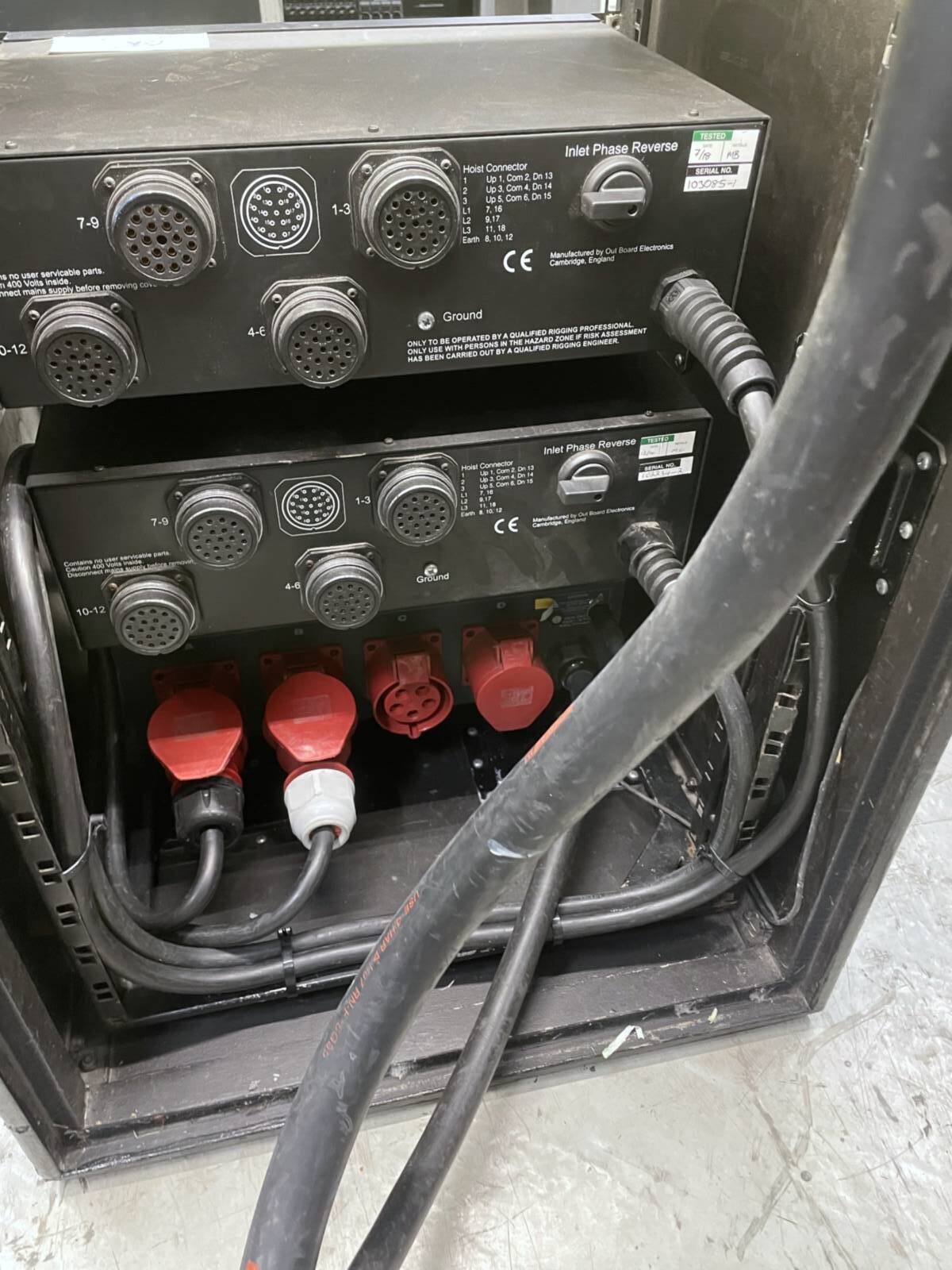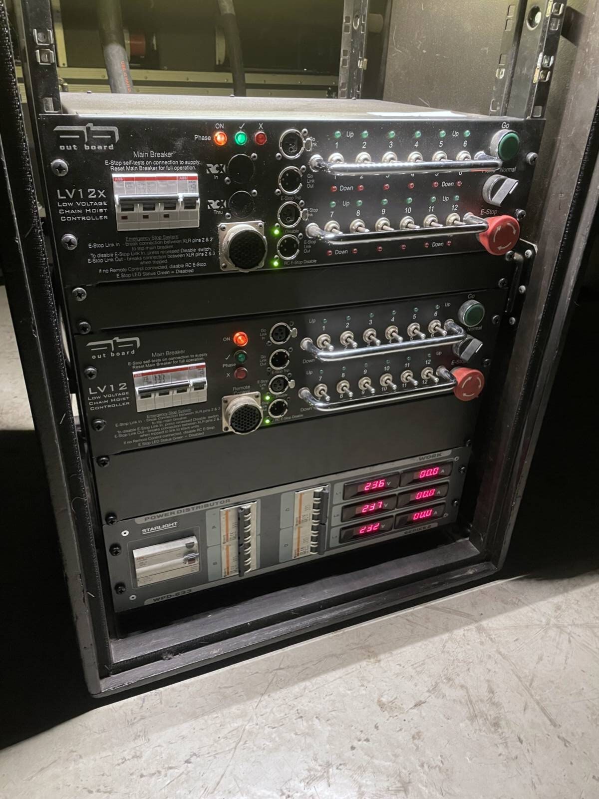 Chain hoist controller designed for precise and reliable control, supplied without cables or power distribution unit, suitable for integration with existing rigging systems.