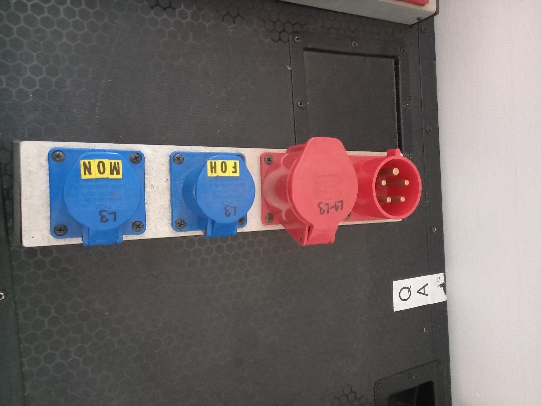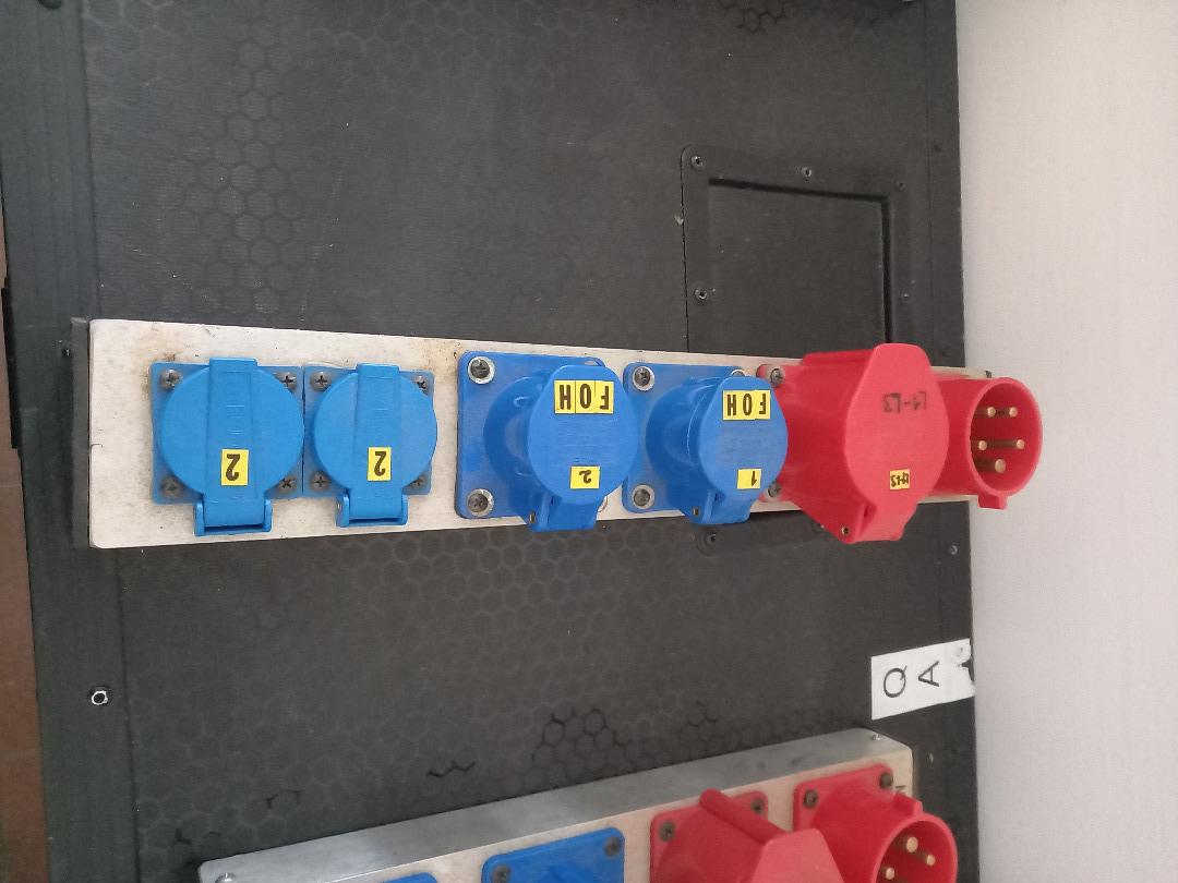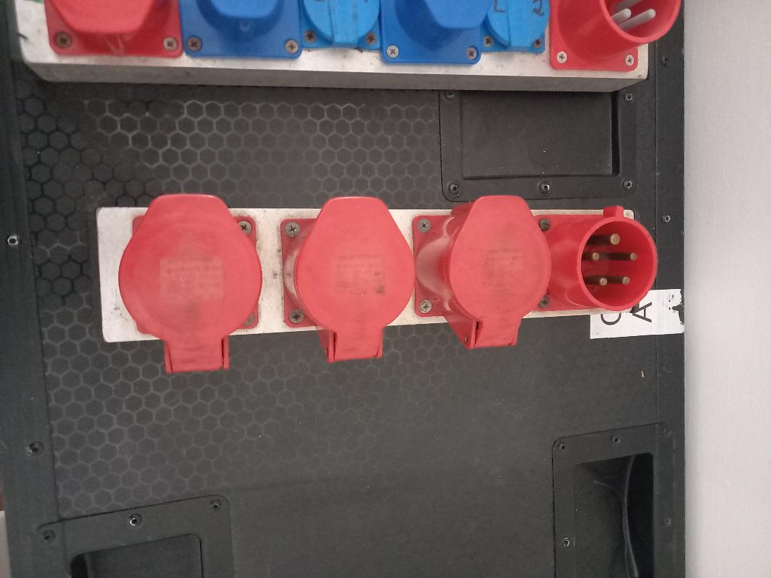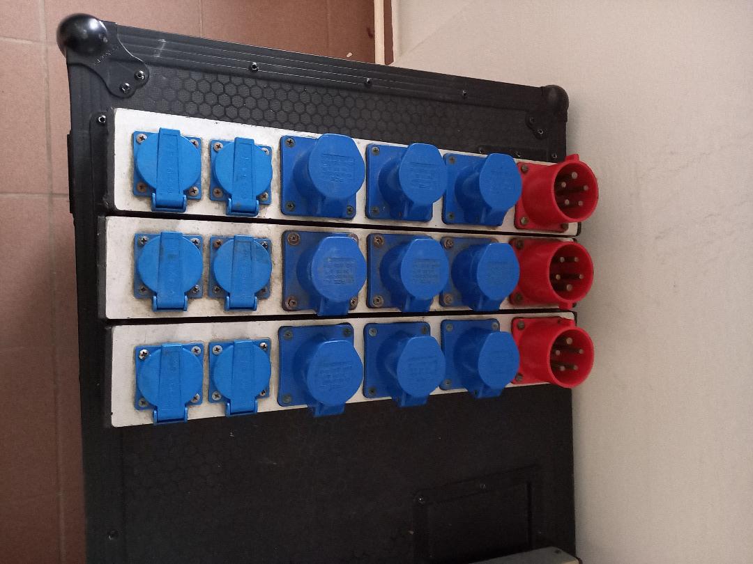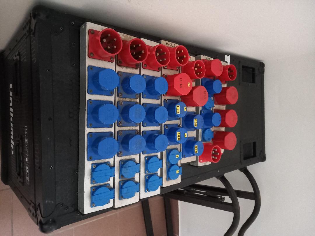 - 1x 32A auf 2x CEE 16A 1-phasig blau, 2x Schuko, 1x CEE 16A 3-phasig