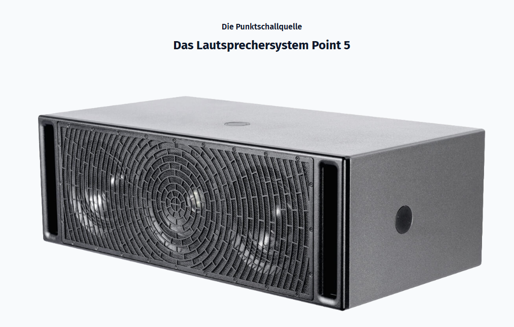 Das Lautsprechersystem POINT 5 ist das Ergebnis einer aufwendigen Entwicklung, mit dem Ziel, einen modernen, qualitativ hochwertigen und professionellen Wandler zu konstruieren, der durch seine technische Konzeption neue und besonders vielseitige Anwendungen ermöglicht. Dabei wurden die Anforderungen der Studiotechnik, der Konferenz- und Beschallungstechnik ebenso berücksichtigt, wie die der Festinstallation. Das Erscheinungsbild der POINT 5 ist elegant, zurückhaltend und hochwertig. Die technische Realisierung befindet sich auf höchstem Niveau. Sie ist eine Synthese aus Platzbedarf und akustischer Leistungsfähigkeit.