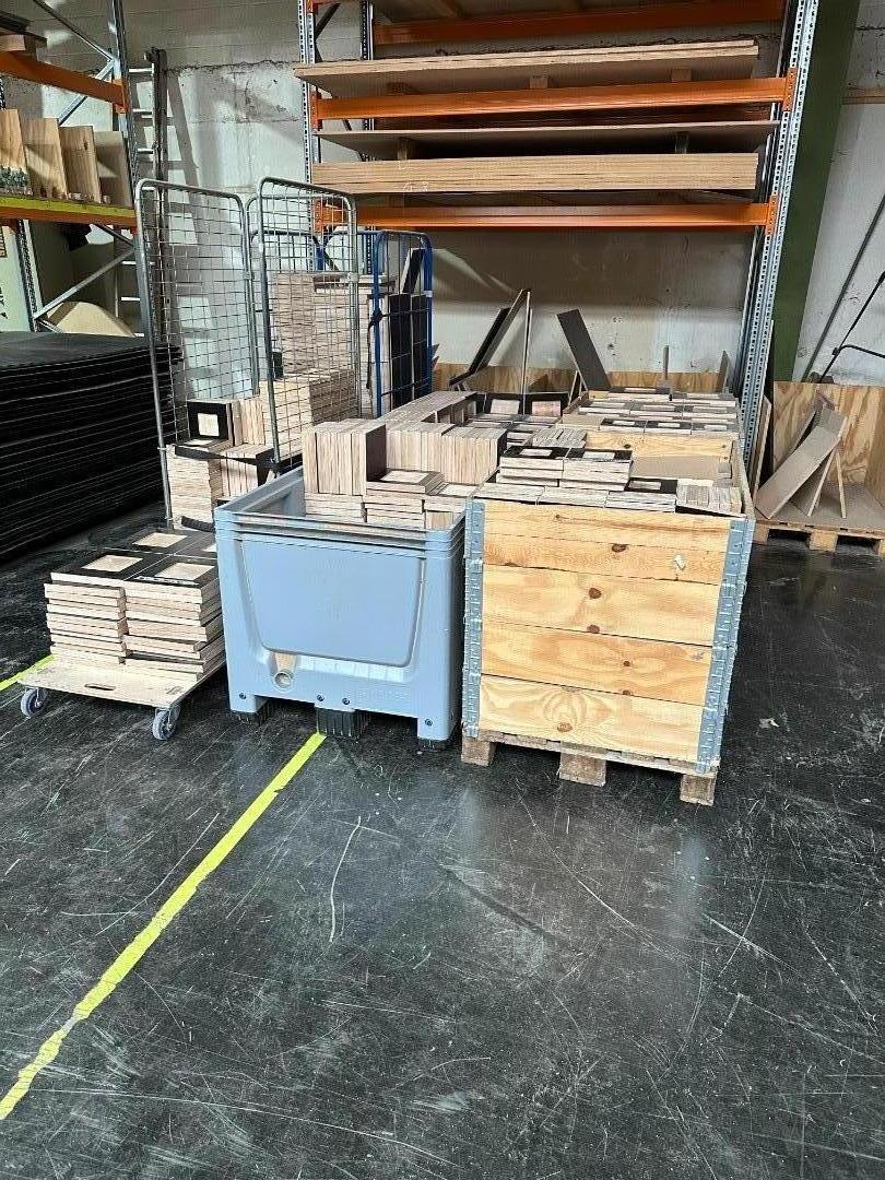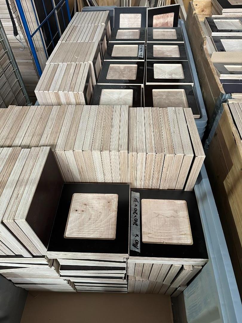 224 Stück GT Stage Podestunterlagen-Pallhölzer-Unterpallungen-Gerüstspindelunterlage 240x240x30mm mit 155x155mm Ausschnitt (6,00€ netto / 7,14€ brutto pro Stück)