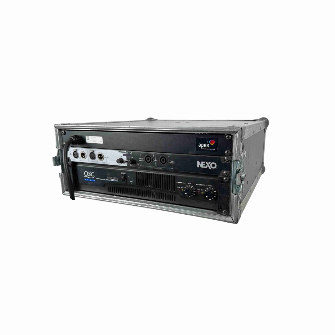 The QSC RMX1450 is an amplifier with symetrical 2 XLR/Jack inputs and 2 x 600 W speakon outputs offering a perfect match to drive up to 8 NEXO PS8 speakers in stereo.