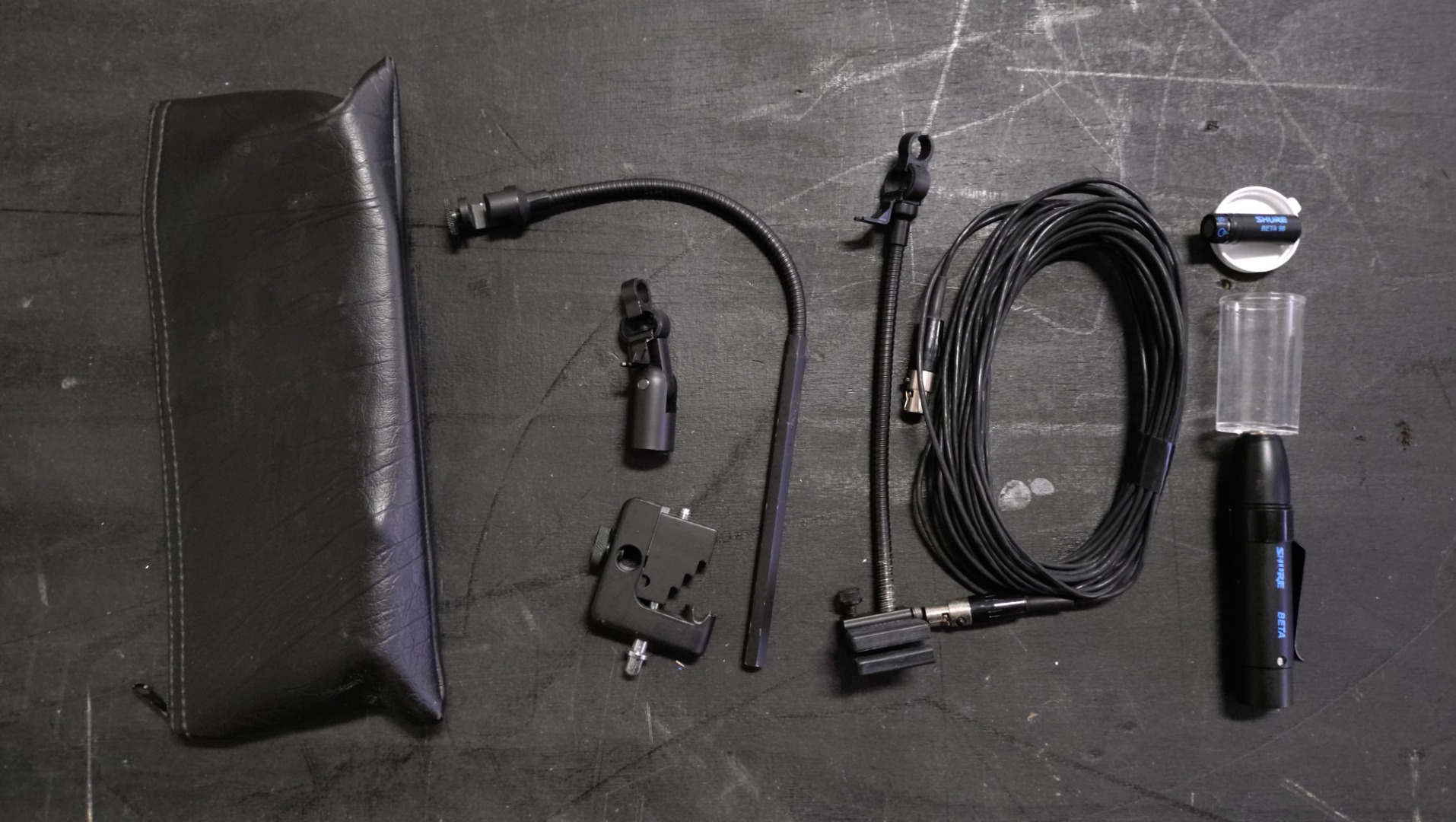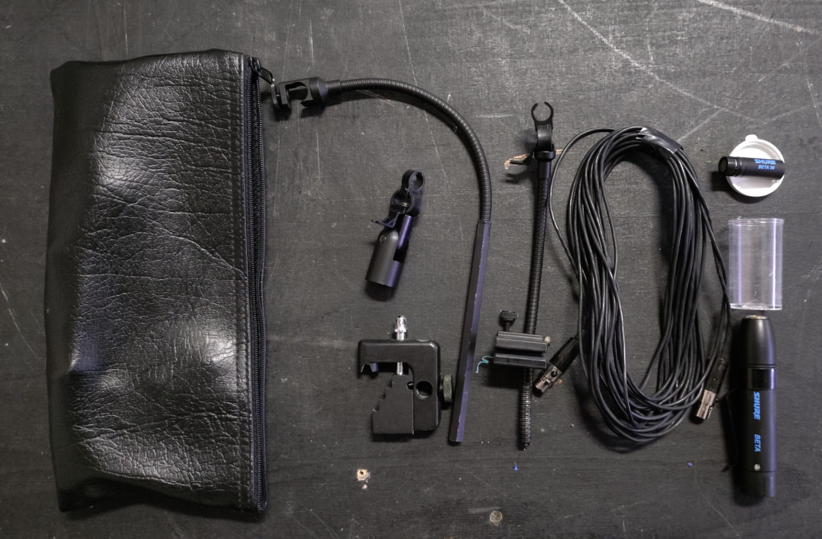 Zum Lieferumfang gehören die Drumhalterung, die Bläserhalterung sowie die Stativhalterung, das Speiseteil, die Mikrofonkapsel und das Kabel sowie die Tasche. Lediglich die Windschütze sind nicht mehr vorhanden.