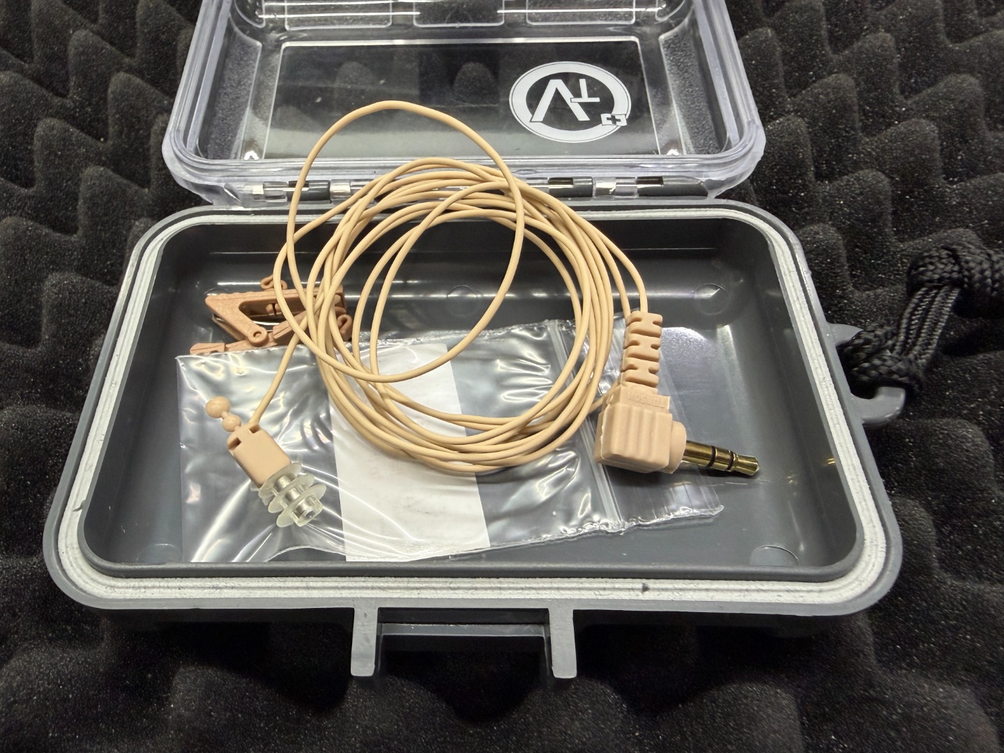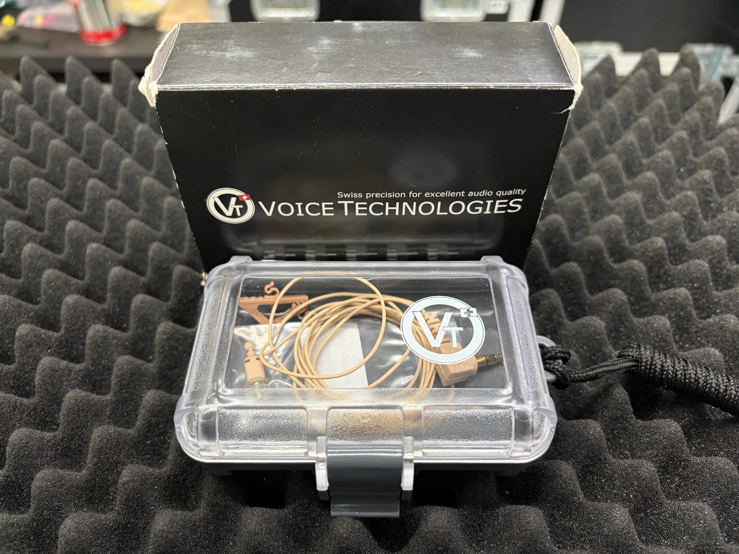 The cabling consists of an ultra-thin cable. The Voice Technologies VT60M is supplied in the lightweight and transparent EARPHONE BOX, which contains an additional earpiece and a clip.