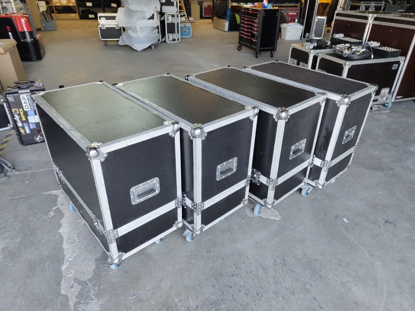 Die Lautsprecher wurden geprüft und sind technisch einwandfrei. Zum Lieferumfang gehören die passenden Cases, wodurch das Set direkt transport- und einsatzbereit ist. Die Case-Maße betragen 88 x 45 x 83 cm.