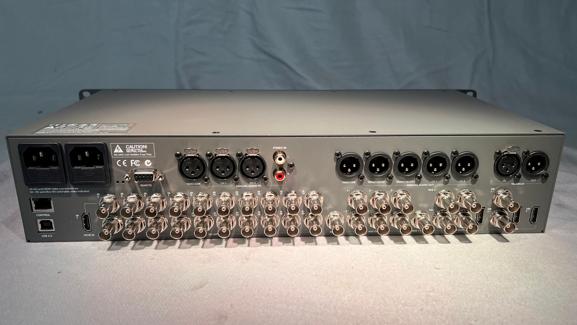 21 Videoeingänge (20× SDI aktiv + 1× HDMI), 16 Videoausgänge, 6 Aux-Ausgänge, SDI bis 6G, 2 Multiviews, Audio: 2× XLR + 2× RCA In / 2× XLR Program + 2× XLR Monitor Out.