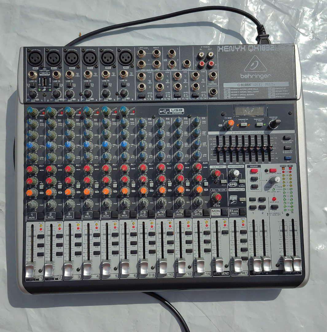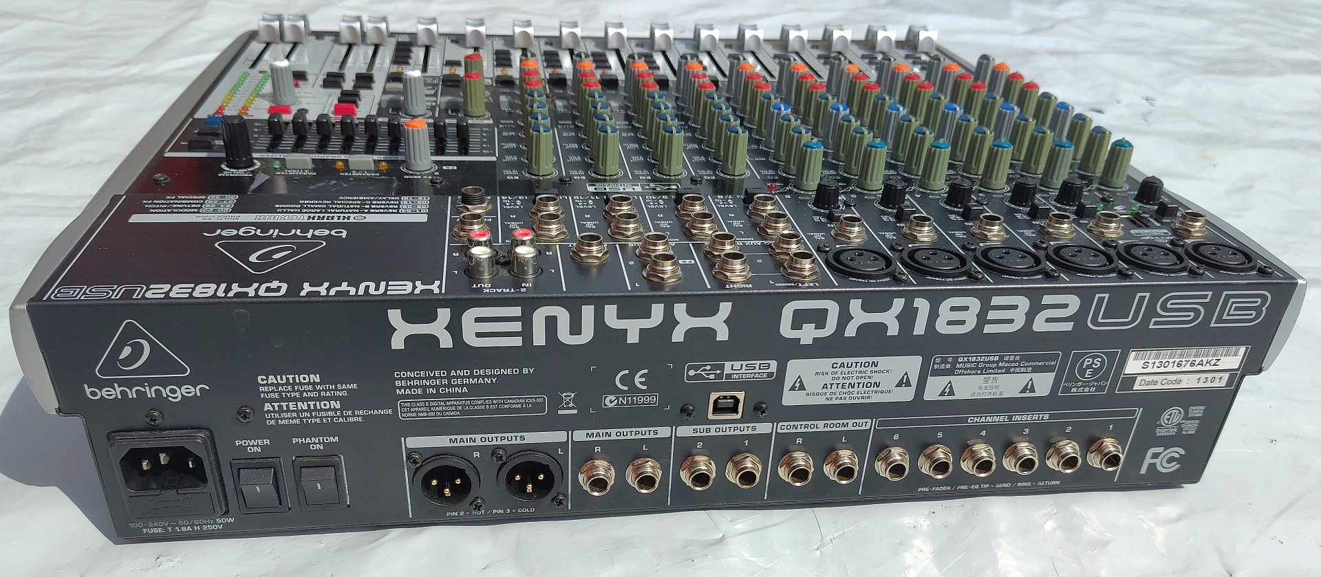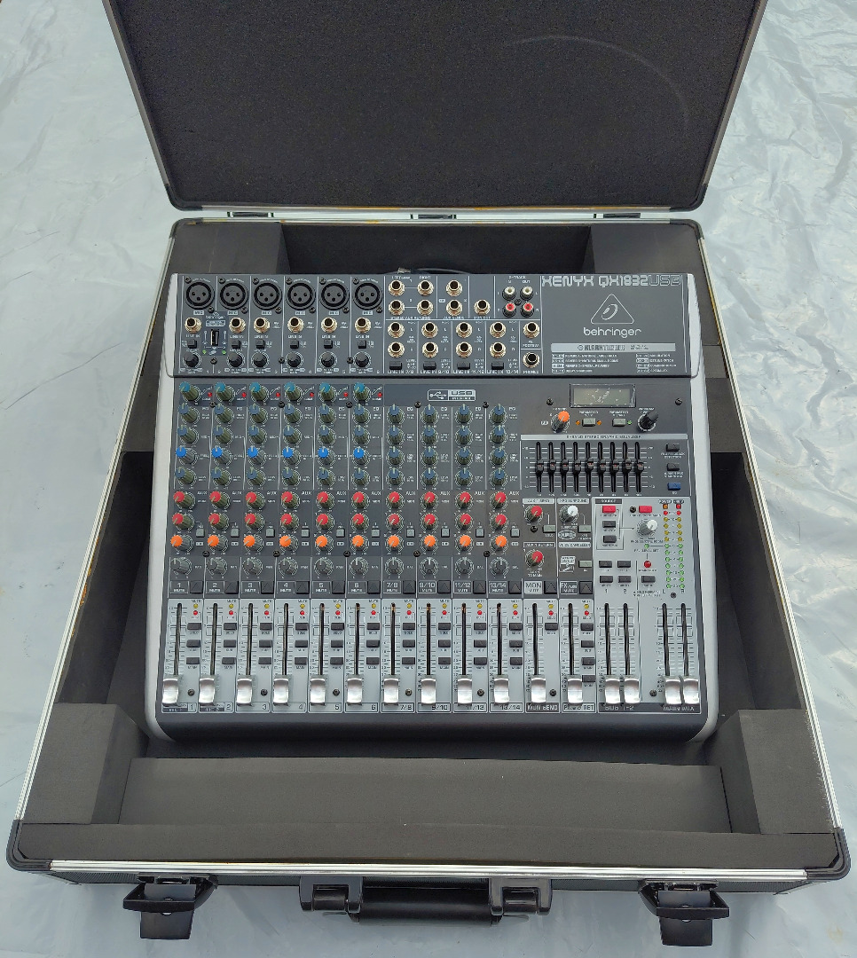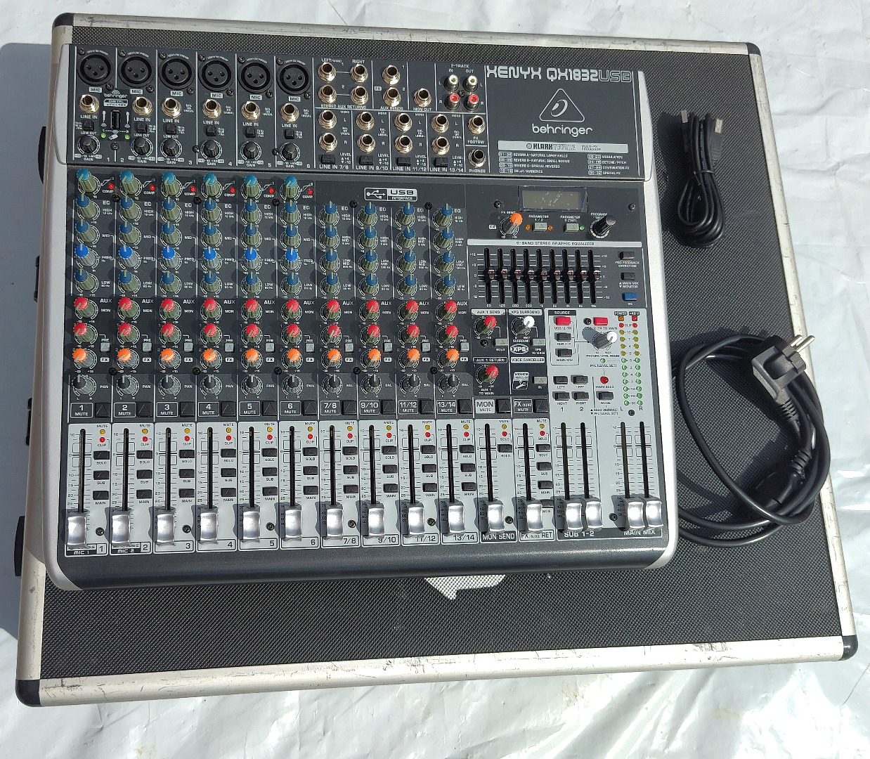 For sale is a Behringer Xenyx QX1832USB mixing console, including the Thomann Behringer Xenyx 1832 FX case.