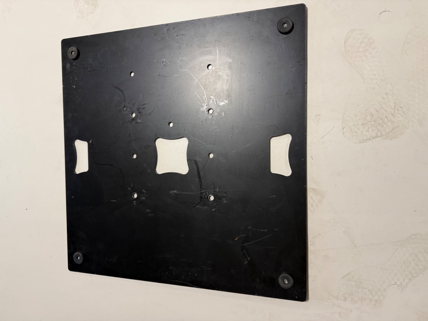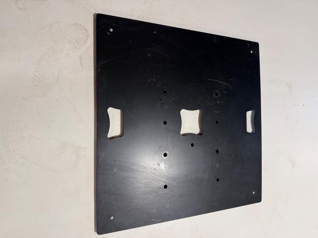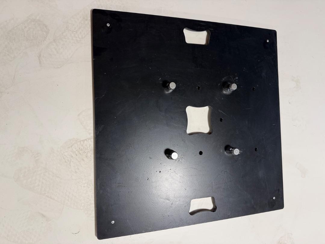 Wir bieten gebrauchte Bodenplatten für Traversen in den Maßen 75 x 75 x 0,6cm, Gewicht 25kg schwarz pulverbeschichtet zum Verkauf.