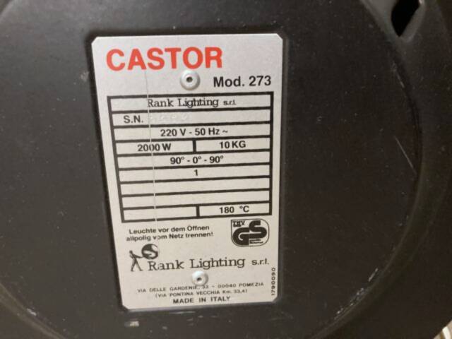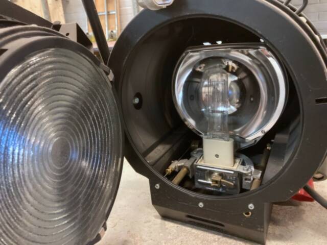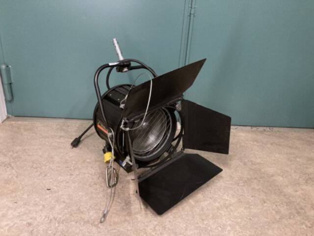 Set of two studio fresnels with barndoors, lacking filterframes. Features pole-operated pan, tilt, and zoom, equipped with German type schuko plug. Offers beam adjustment from 8.5° to 45°. Maintained professionally and includes used bulb.