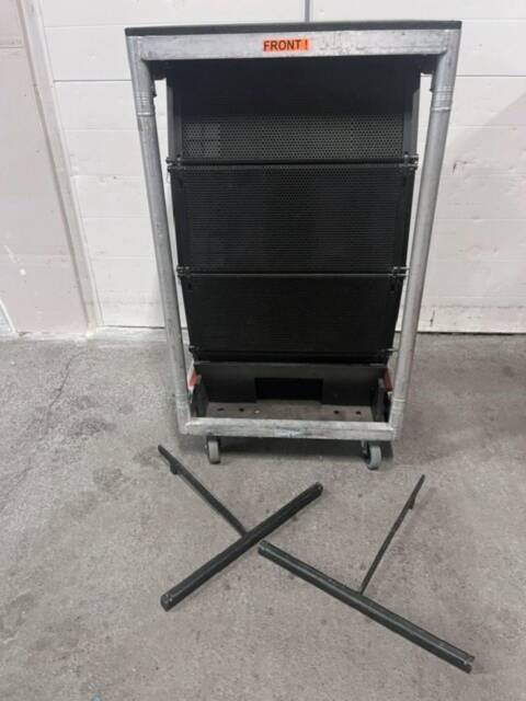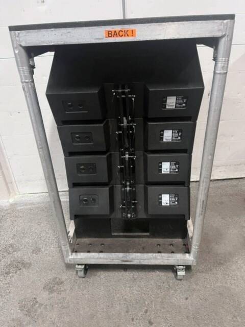 This package includes four V12 line array loudspeakers with NLT4 connectors, a touring cart for up to four V8/V12 speakers, and two flying adapters suitable for V8/12 models, providing a complete professional sound reinforcement solution for touring and installation applications.