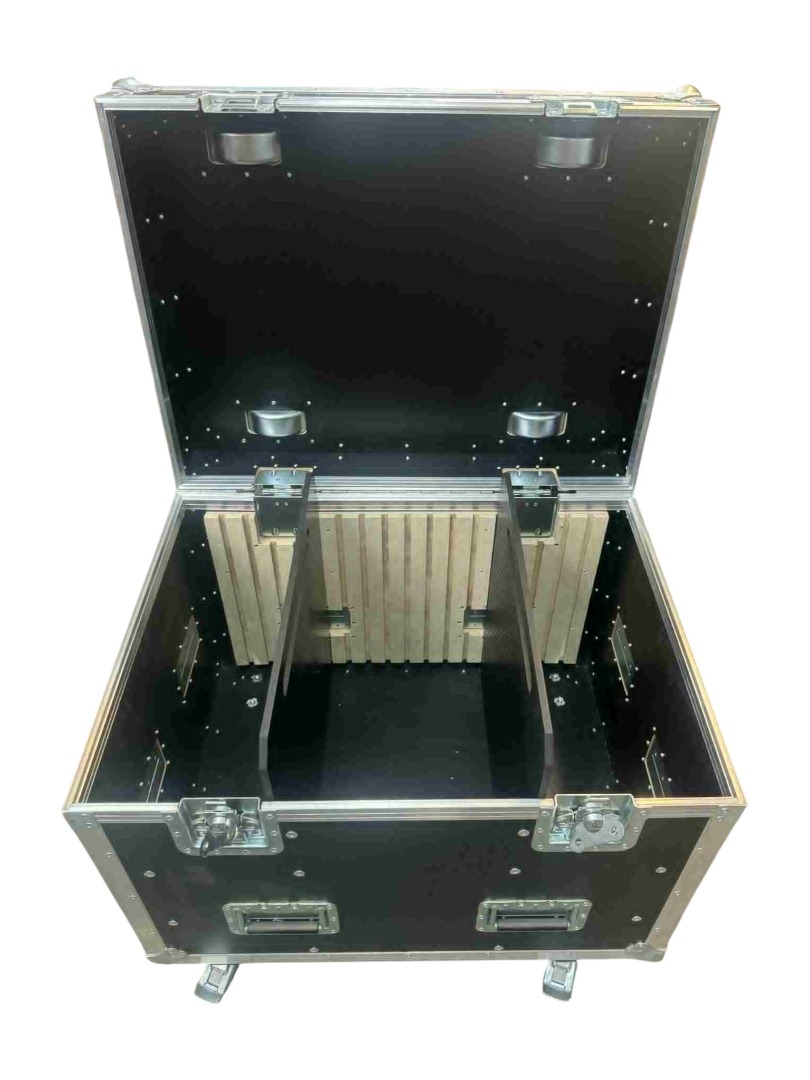 Multiflex 80×60 ist eine Nutz-/Transportbox mit Fächern, die für die Aufbewahrung und den Transport von Kabeln und technischem Zubehör konzipiert ist. Sie ist aus robustem Sperrholz (9 mm dick) gefertigt, mit Aluminiumprofilen und Stahlkugelecken verstärkt und bietet Sicherheit und Mobilität in Produktionsumgebungen.
