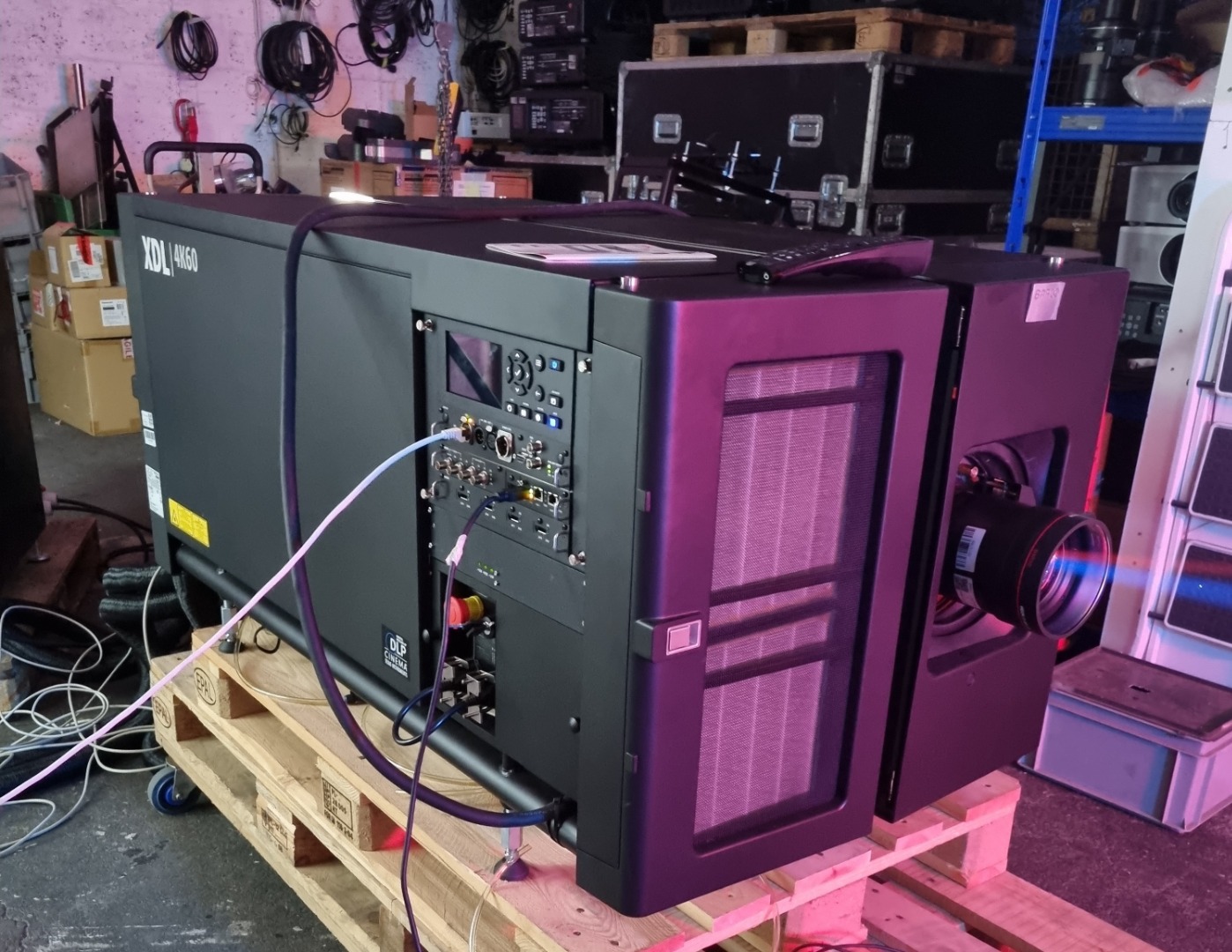 The Barco 4K60 is one of the most powerful projectors in the world. The projector is so powerful that it needs cooling fluent controlled by the two external cooling units. The cooling system is connected to the back of the projector with tubes that pump the cooling fluid through the projector. The package includes the custom stand that fits both cooling units and the projector.