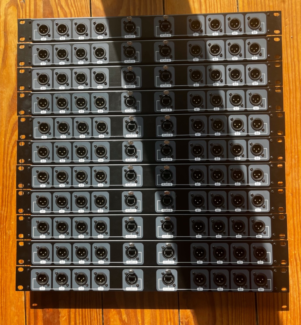 Durch Umstieg auf DB25 Snakes habe 11x 1HE Rack Geräte übrig mit je 2x RJ45 und 8x 3-pol XLR female, alle gekauft zwischen 2022 und 2025. Ich hatte die zur Audio-Übertragung in einem Homestudio verwendet (geht, zulange man mit 75 Ohm Audiokabel statt 110 Ohm DMX-Kabeln reingeht, denn die Ethernetkabel machen bei der Übertragung keinen Unterschied). An der Rückseite können evt. kleine Kratzer oder Dellen vorliegen (siehe Fotos), was aber die Funktionalität nicht beeinträchtigt. Größe: 1 HE hoch, 19" breit, 35mm tief.