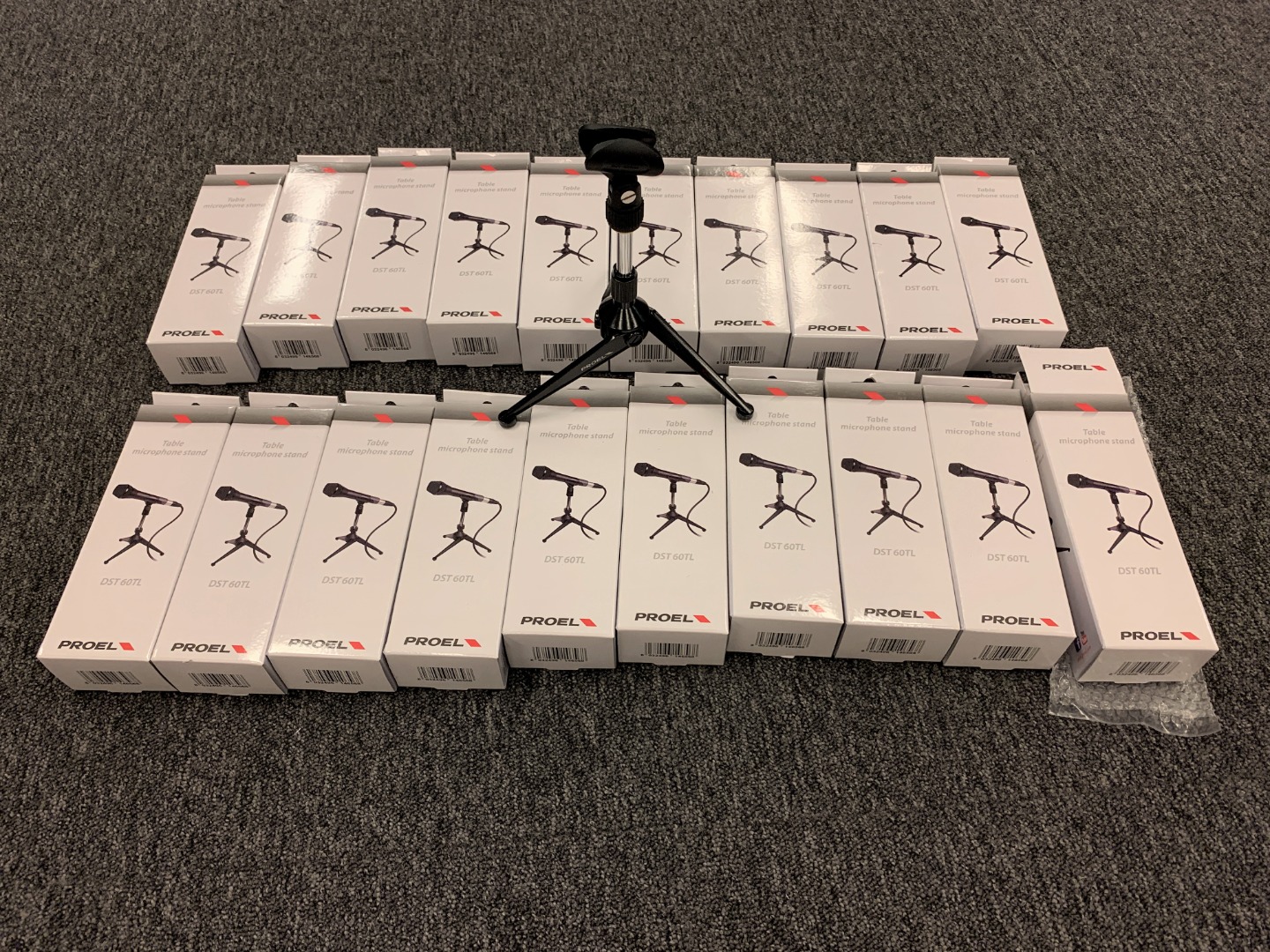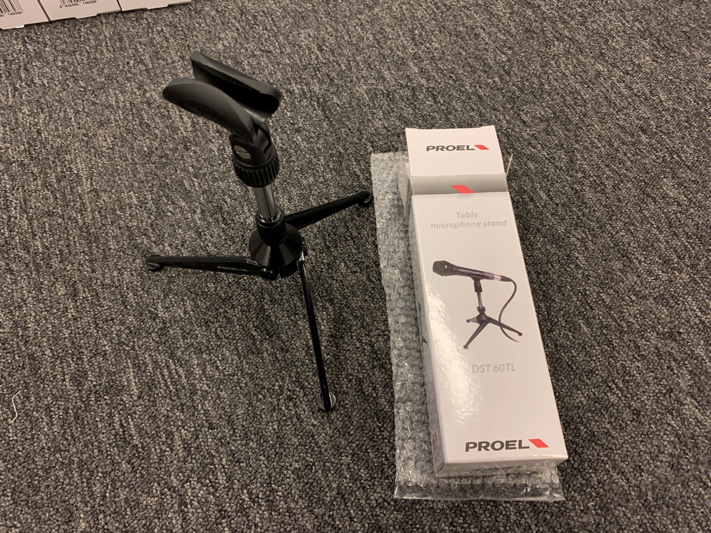 New condition (just opened) Proel DST60TL desktop microphone metal base/stand, completely collapsible. It comes with an ABS microphone clip and universal adapter. Available in matt black finish.