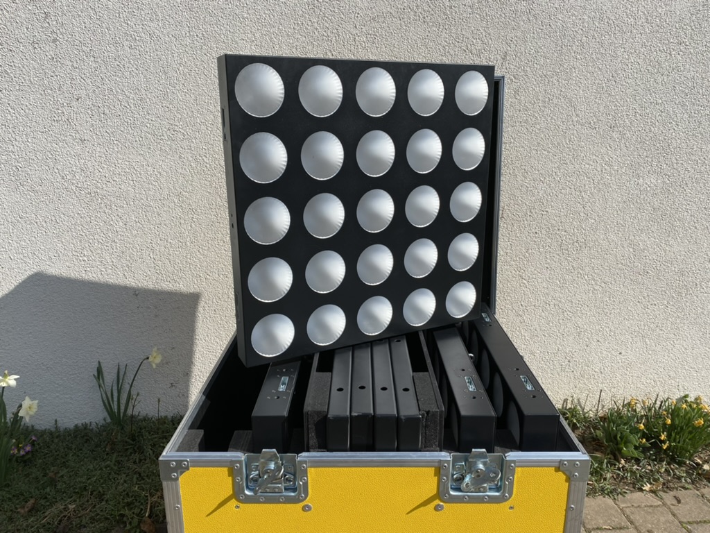 Ich biete insgesamt 16 Cameo Matrix 100W Scheinwerfer an, verpackt in 4 stabilen Cases. Jede Kiste enthält 4 Scheinwerfer sowie sämtliches Zubehör, sodass die Lampen direkt einsatzbereit sind.